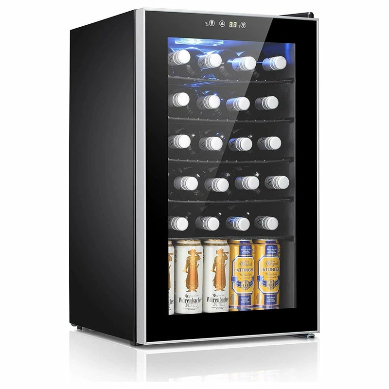 Wine Cooler or Cabinet 24 Bottle Beverage refrigerator Small Wine Cellar Soda Beer Counter Top Bar Fridge Quiet Operation Compressor Digital Freestanding Clear Glass Door for Office or Dorm.