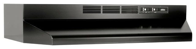 The Broan 413623 36 In. Two-Speed Non-Ducted Under Cabinet Range Hood, in black, is Broan’s most economical non-ducted hood with filtration of airborne cooking contaminants. The unit is non-ducted and has a non-ducted filter to remove smoke and odors. The sides are mitered and the bottom edge hemmed, with no sharp edges for safety and good looks. The unit has separate rocker-type fan and light switches plus a protective lens covers the light bulb to distribute light evenly over the entire cook top area.