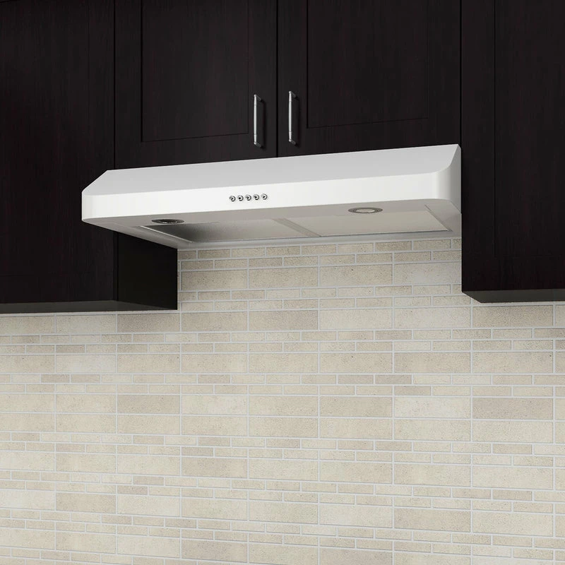 With it’s classic white color and beautiful rounded corners, the Slim DW1R under-cabinet range hood will add style and elegance to your kitchen. With a height of only 5 inches and rear or top venting applications, the DW1R easily replaces any existing under-cabinet range hood. Made from highly resistant 430 stainless steel, this appliance is quiet and offers continuous air renewal by effectively removing fumes and cooking greases. This range hood features easy-to-use, three-speed push button controls, stylish halogen lights for effective task lighting and five-layer aluminum mesh dishwasher-safe filters.