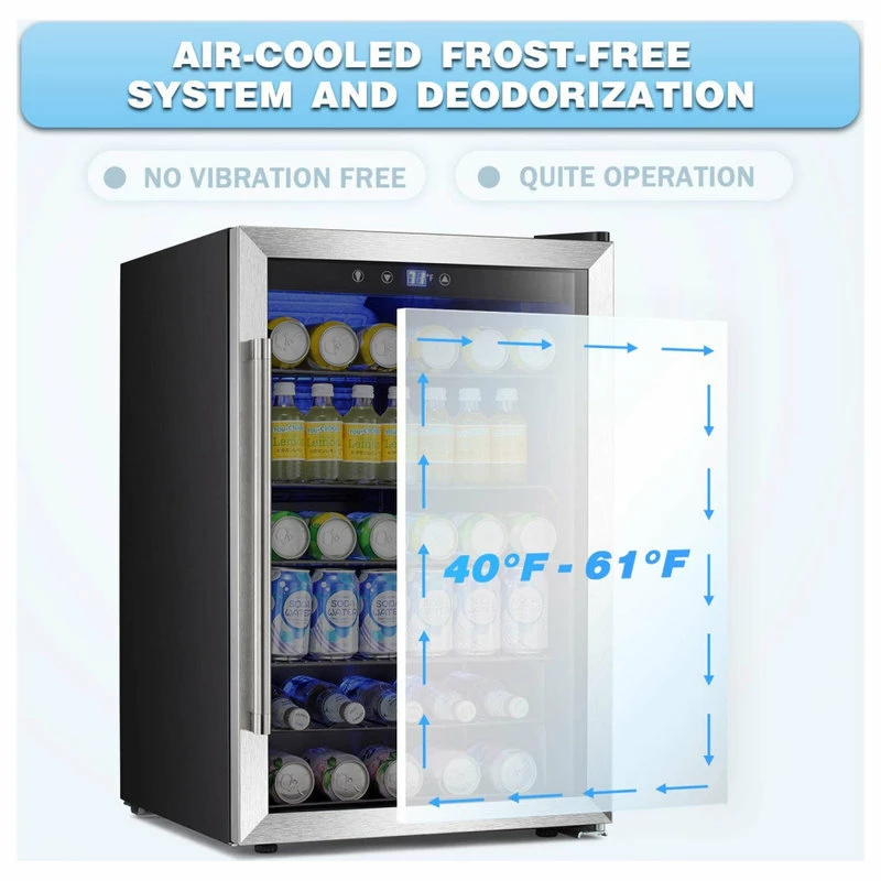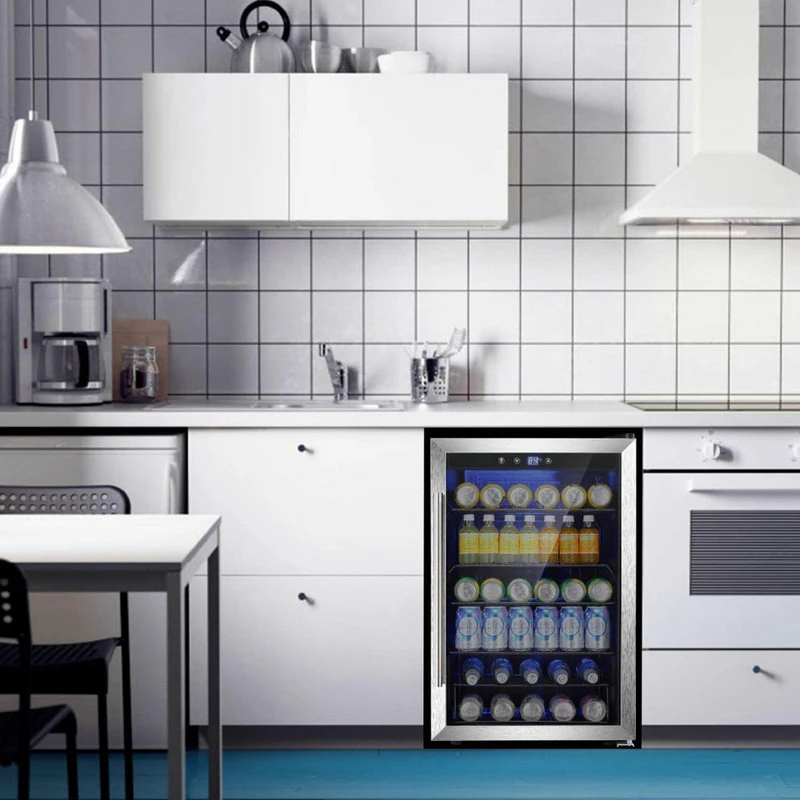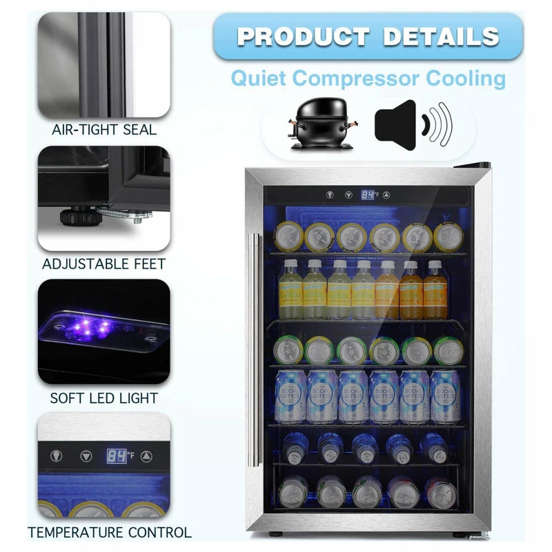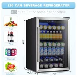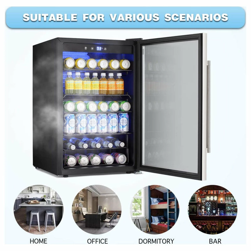 COMPACT BEVERAGE COOLER : 20.5 x 21.3 x 31.4 inches mini refrigerator can keep a variety of canned drinks or wine chilled without taking up too much space at your home, dorm, bar or office. It can conveniently hold 120 standard-sized drinks cans to impress your guests during parties,and this high-quality Beverage Refrigerator will surely fit and add an elegant accent to any home decor.