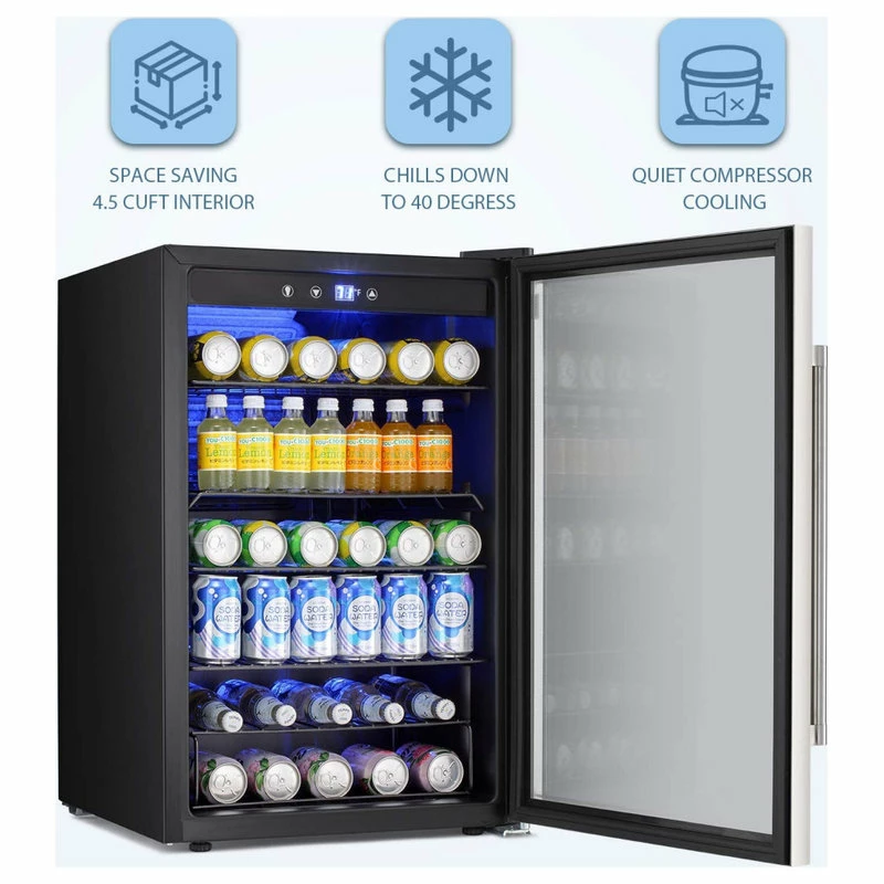 PERFECT CAPACITY : Antarctic Star 4.5cu.ft.Beverage Refrigerator features an elegant see-through, left hinge glass front door with a stainless steel frame for you to view your wine, beer or soda at a glance. With its reinforced glass door with air tight seal and help to maintain an ideal humidity level, this beverage refrigerator gives you a compact and modern design.Blue soft LED interior lighting not only beautifully showcases the wine or drink but also won’t damage the wine or drink.