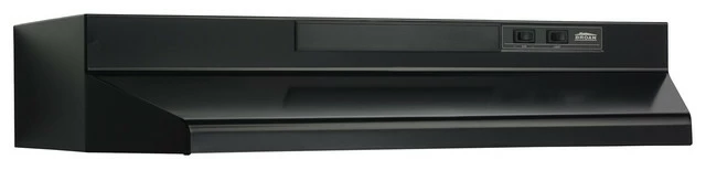 The Broan F403023 30 In. Two-Speed 4-Way Convertible Under Cabinet Range Hood, in black, is constructed with quality, good looks and is superior to the competition whether ducted vertically, horizontally, or non-ducted. For your safety, the sides are mitered and the bottom edge hemmed, with no sharp edges, and for your convenience, the easily removable filters are dishwasher safe for simple cleaning. With its many versatile installation options and powerful but incredibly quiet 160-190 CFM blower, this is the perfect range hood for any type of kitchen.