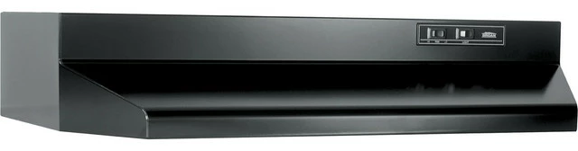 The Broan 403023 30 In. Two-Speed Ducted Under Cabinet Range Hood, in black, out-performs the competition whether ducted vertically or horizontally. The sides are mitered and the bottom edge hemmed, with no sharp edges for safety and good looks. The enclosed light and fan/filter assemblies make for easy cleaning. The unit has a two-speed fan switch with separate light switch and the motor is permanently lubricated. Keyhole mounting slots make the range hood easier to install.