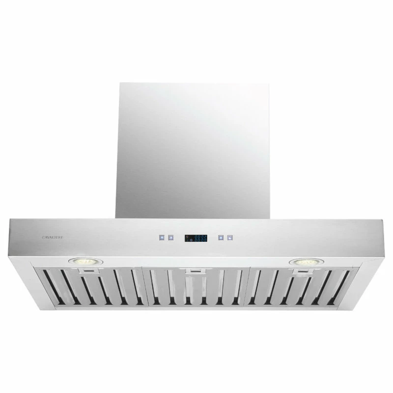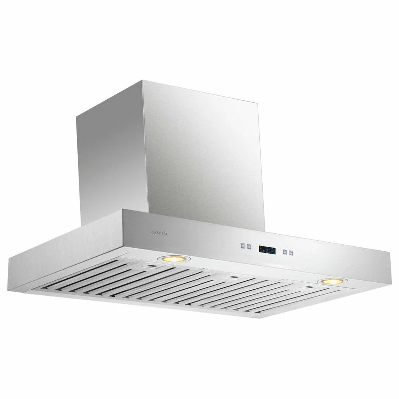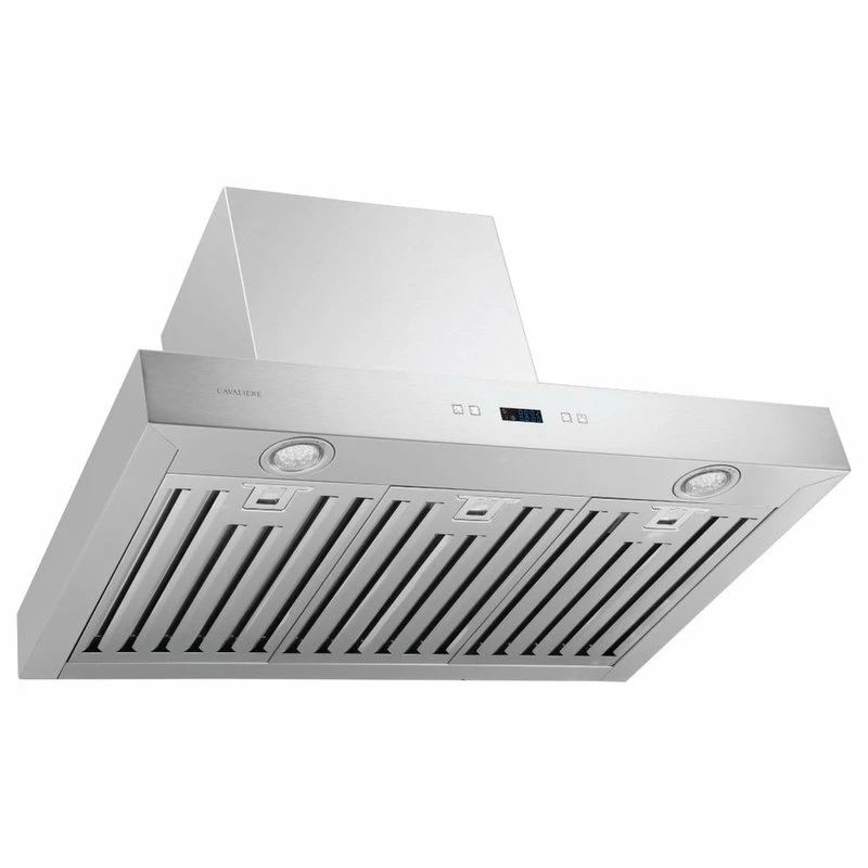 Dante Collection 30″ Stainless Steel Wall Mounted Range Hood with 900 CFM With a touch of European design and the timeless class of stainless steel, Cavaliere presents the Dante Series wall mounted range hood. Includes a low noise 900 CFM dual chamber centrifugal blower, telescopic chimney that fits ceilings measuring between 96 and 108″, six-speed electronic controls with LED display, and three dishwasher friendly six layer aluminum grease filters. Features: Low Noise Dual Centrifugal Motors Six-Speed Electronic Controls with LED Display High Quality 19 Gauge Stainless Steel Construction Delayed Power Auto Shut Off with 30 Hour Cleaning Reminder Telescopic Chimney Fits 96 to 108 Inch Ceilings ETL Listed Optional Duct Cover Extension Available for Ceiling Heights up to 120″ Sold Separately Ductless Venting Available with Optional Recirculating Conversion Kit Sold Separately Available Baffle Filter Upgrade Sold Separately Specifications: Maximum Ceiling Height: 120″ Minimum Ceiling Height: 91″ Dimensions: 30″ Width x 43″ Height x 19″ Depth 900 CFM Centrifugal Blower Lighting: Two 35W Halogen Lights 6″ Round Duct Vent Exhaust Sones: 0.3 – 7.0 Filter: Aluminum Grease 120V / 60Hz