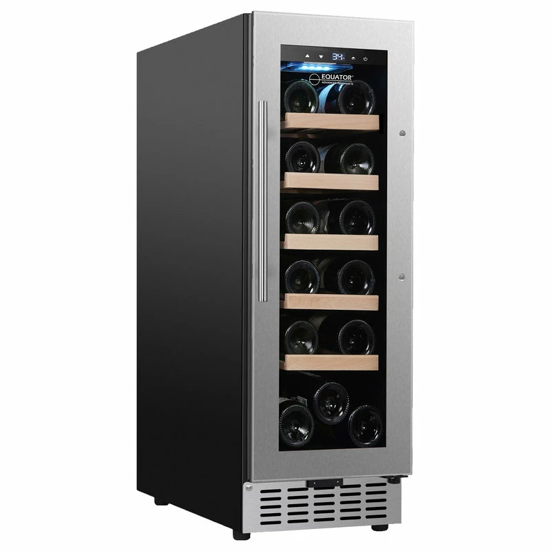 Protect and preserve your wine collection with Equator’s 18-Bottle Wine Refrigerator. Measuring at 32.28x11x23 inches (HxWxD) and 1.73 cubic feet, this powerfully compact refrigerator was engineered to keep your wine optimal for swirling and sipping. The compressor fan cooling eliminates potential hot spots while the single temperature control keeps your wine perfectly chilled. And the integrity of your wine is always protected with a carbon filter absorbing impurities in the air and the anti UV glass blocking harmful rays. Designed to adapt to any of your needs with adjustable feet, a reversible door, moveable shelves, and freestanding or built-in capabilities, your wines can age with sophistication and grace in any space around your home.