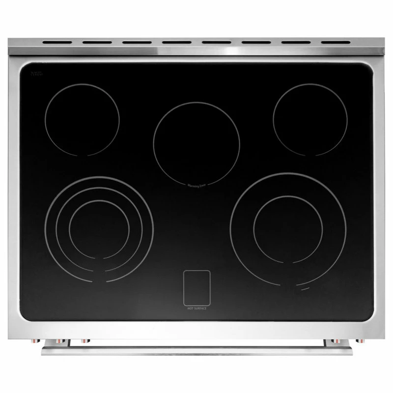 Range: This range features a 5 burner smooth glass-ceramic cooktop, including one triple ring and one dual ring burner, each allowing you to customize your cooking surface, and a warming zone.