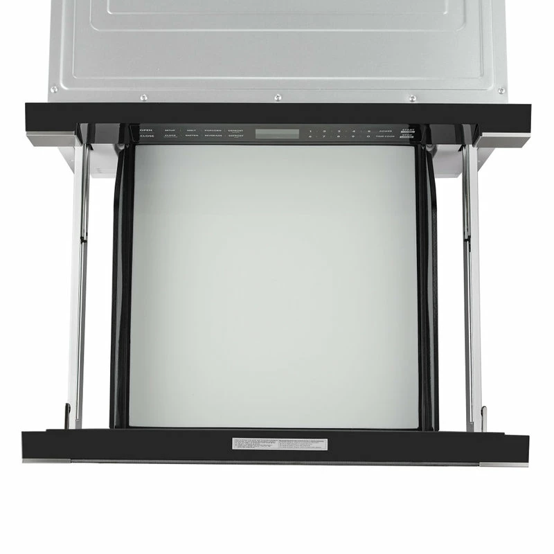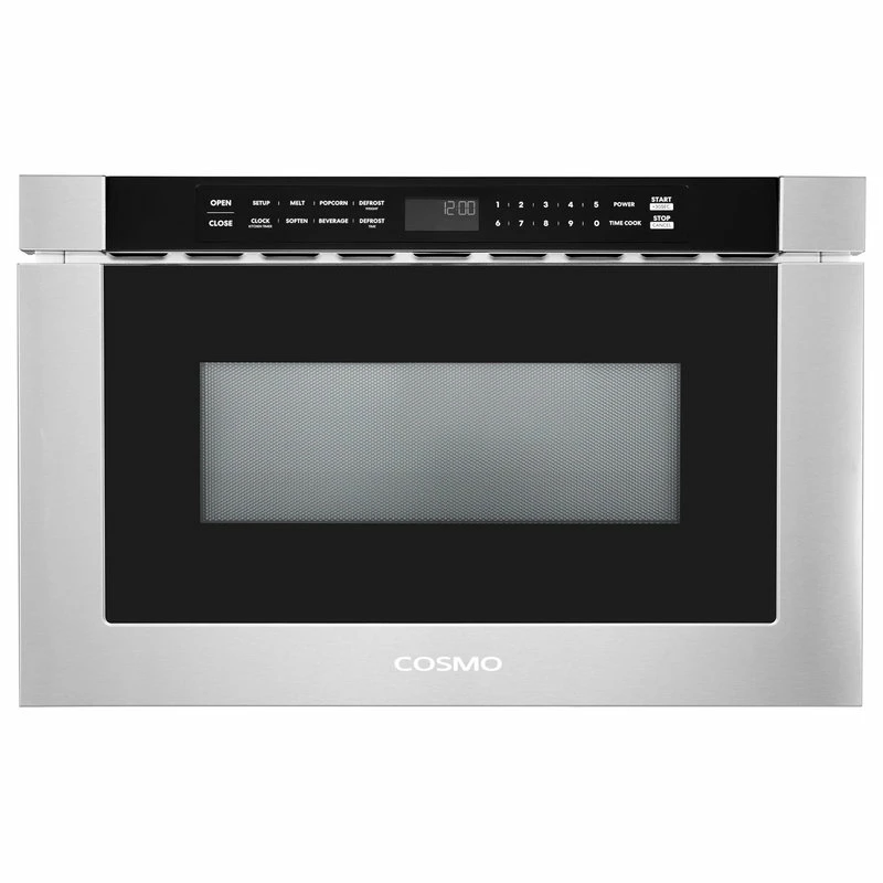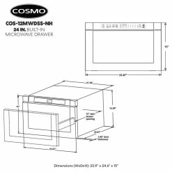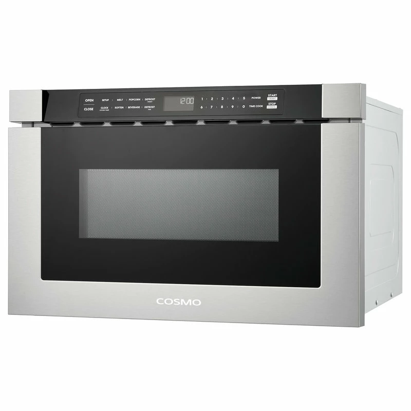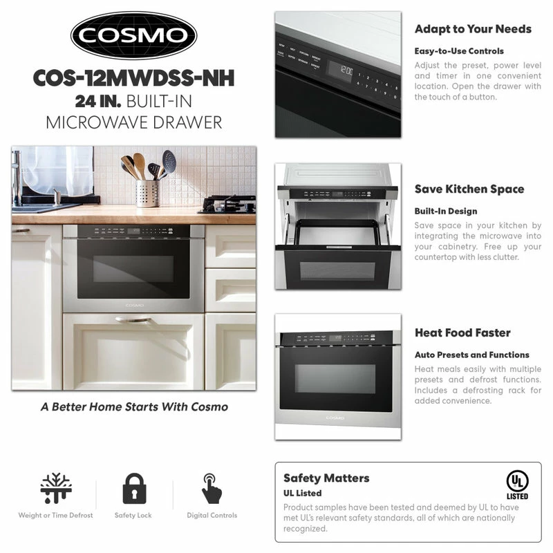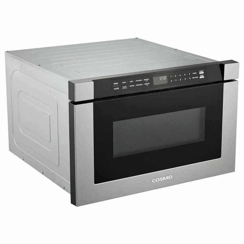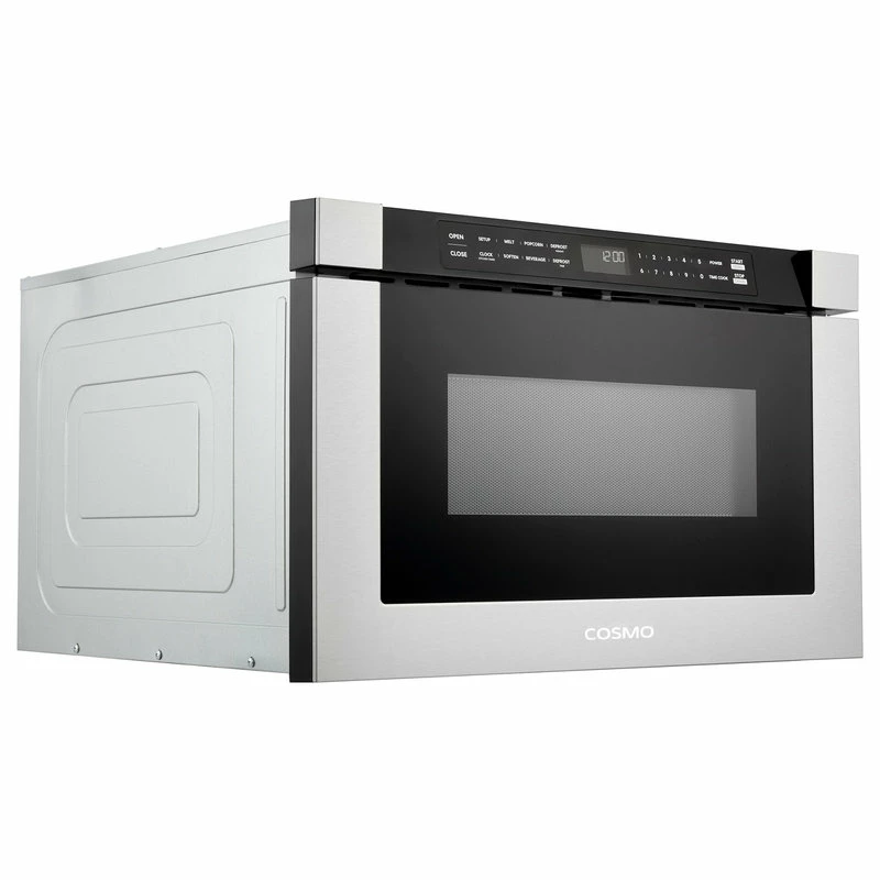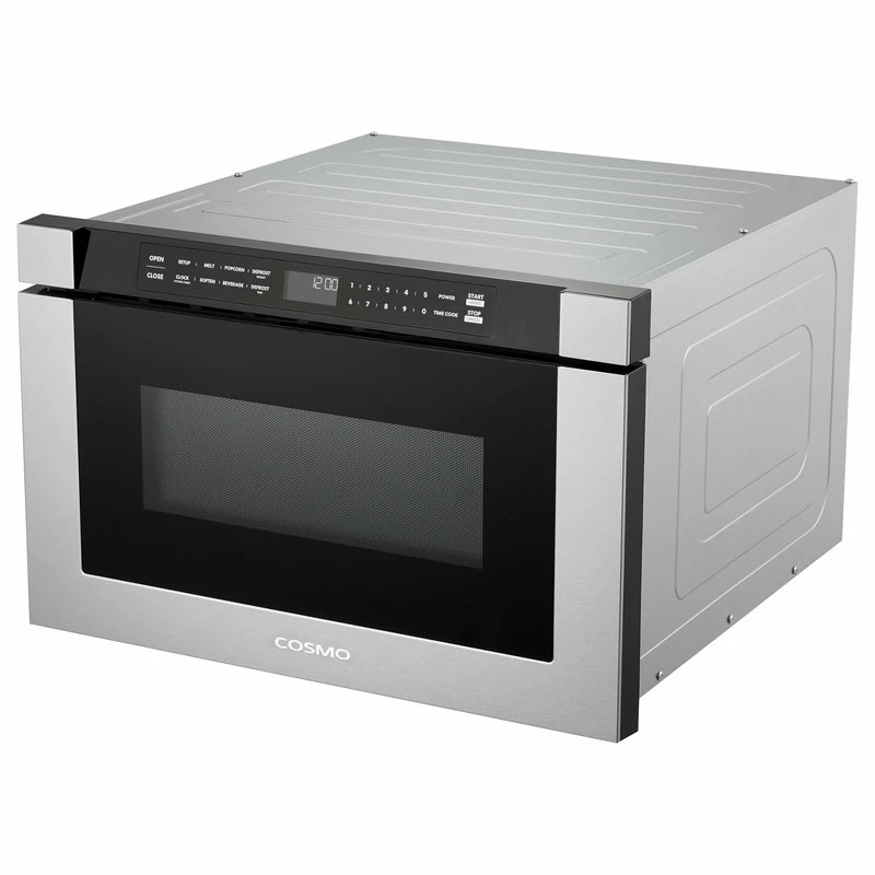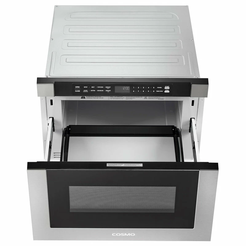 Save space in your kitchen by seamlessly integrating the Cosmo Microwave Drawer into your cabinetry. This top loading microwave drawer provides a clutter-free countertop with its built-in installation. Make every meal delicious with 11 power levels and 1000 watts of cooking power. Easily open and close the microwave with the touch of a button on the easily accessible control panel. Effortlessly heat meals with automatic presets including melt, soften, popcorn and beverage. Effectively thaw food with the weight or time defrost options; a defrosting rack is included, letting you make the the most of the microwave’s capacity. This microwave is built with safety in mind, providing a child lock function. The sleek stainless steel build fits perfectly into any modern kitchen design.