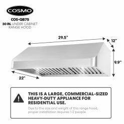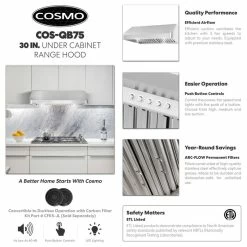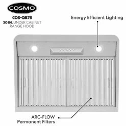 Cosmo presents a modern professional under cabinet range hood that adds bold, distinct flair to your kitchen. This 30-inch range hood fits easily underneath an existing cabinet and has a premium brushed stainless steel body that matches seamlessly with existing kitchen appliances for a modern upscale look. Our under cabinet range hood features high-efficiency motors to move 500 CFM of air through our premium Cosmo ARC-FLOW permanent filters to trap grease, oil, and odors. Our permanent stainless steel filters save you money on replacements year after year and are dishwasher safe for added convenience. Our newly designed under cabinet range hood is both energy efficient and quiet, utilizing high lumen LED lighting for year-round cost savings. A 3-prong, 120V power cord is included for easy installation. Trust Cosmo for your next kitchen appliance for premium quality at factory-direct prices.