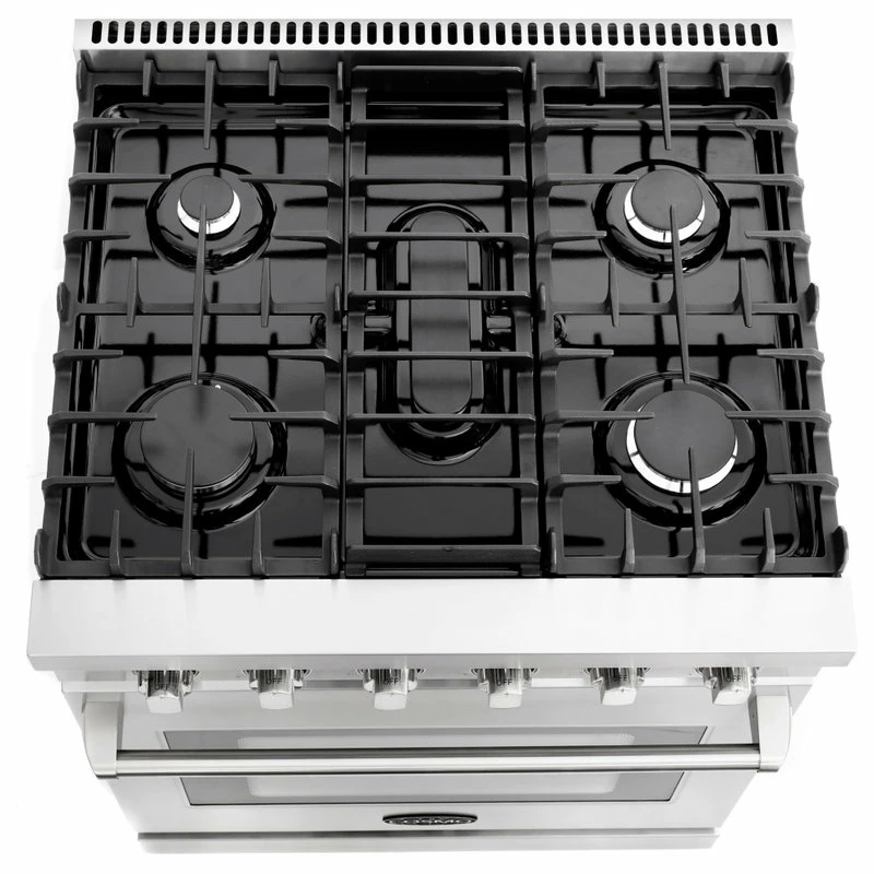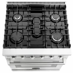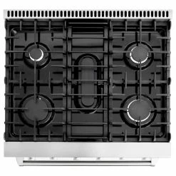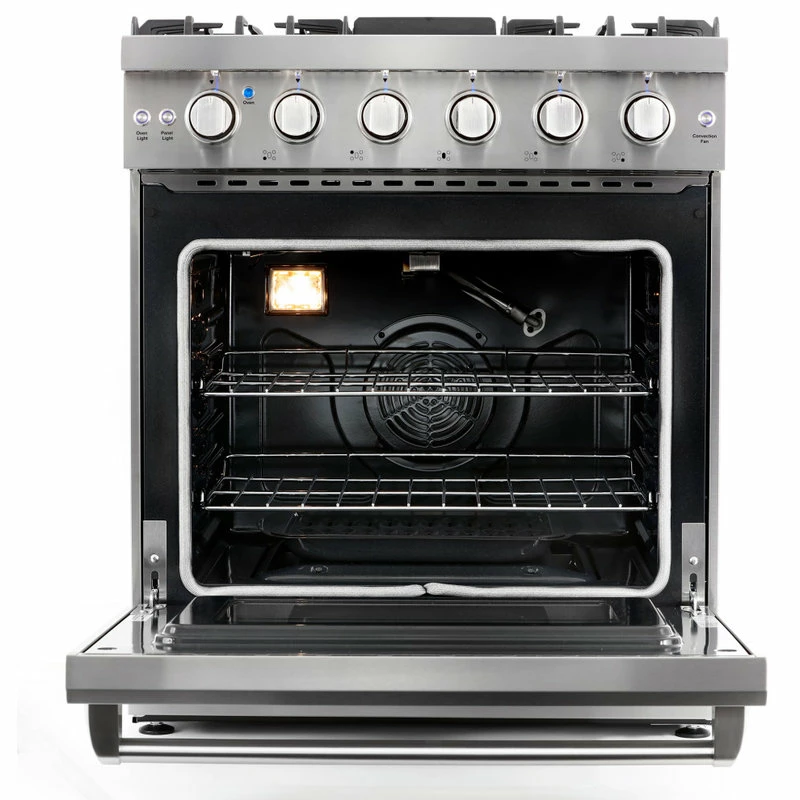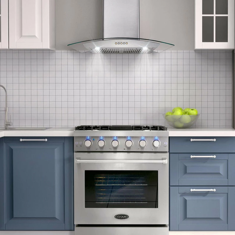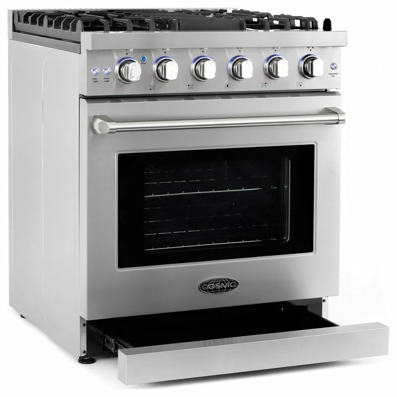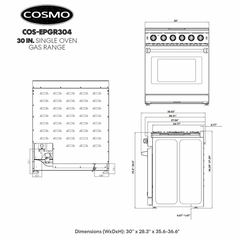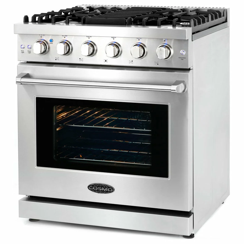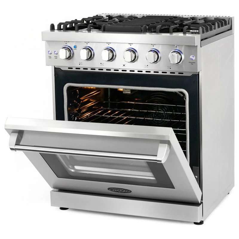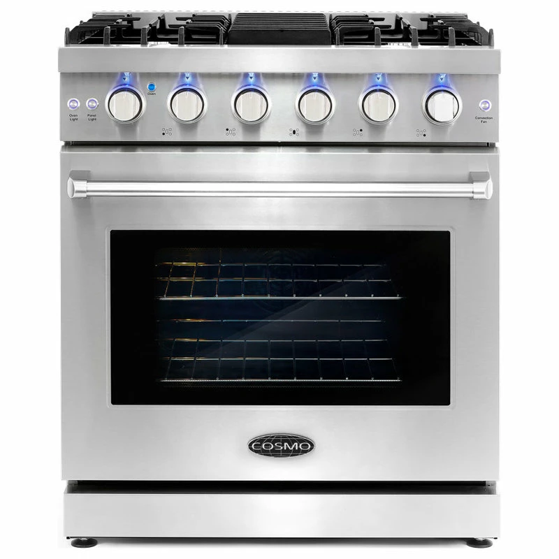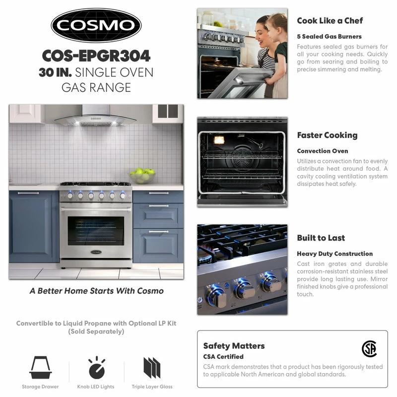 Cosmo’s COS-EPGR304 30 in. gas range brings professional styling and quality into your home kitchen. The large 4.5 cu. ft. oven capacity lets you bake for a crowd and the gas cooktop with 5 sealed burners can handle all your pots and pans with ease. The cooktop is equipped with a variety of different burners to suit needs from the largest pots and pans down to the most delicate sauces: 18,000 BTU, 9,000 BTU, 8,000 BTU, 6,000 BTU, and 4,000 BTU. In the convection oven, powerful fans circulate air for fast, perfectly cooked meals every time. Our special oven functions give you the precision to create everything from juicy roasts to delicate desserts. Designed for durability, this 30 in. gas range is constructed with industrial, corrosion-resistant stainless steel. A removable backsplash means this range is suitable for either freestanding or slide-in installation. A 36 in. model (COS-EPGR366) is available for larger spaces.