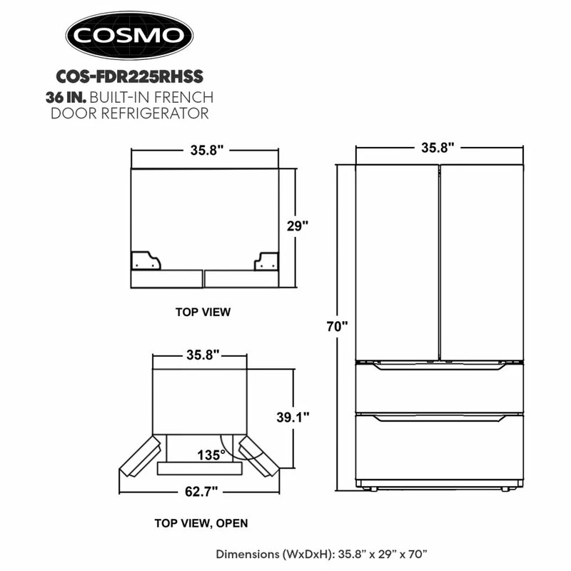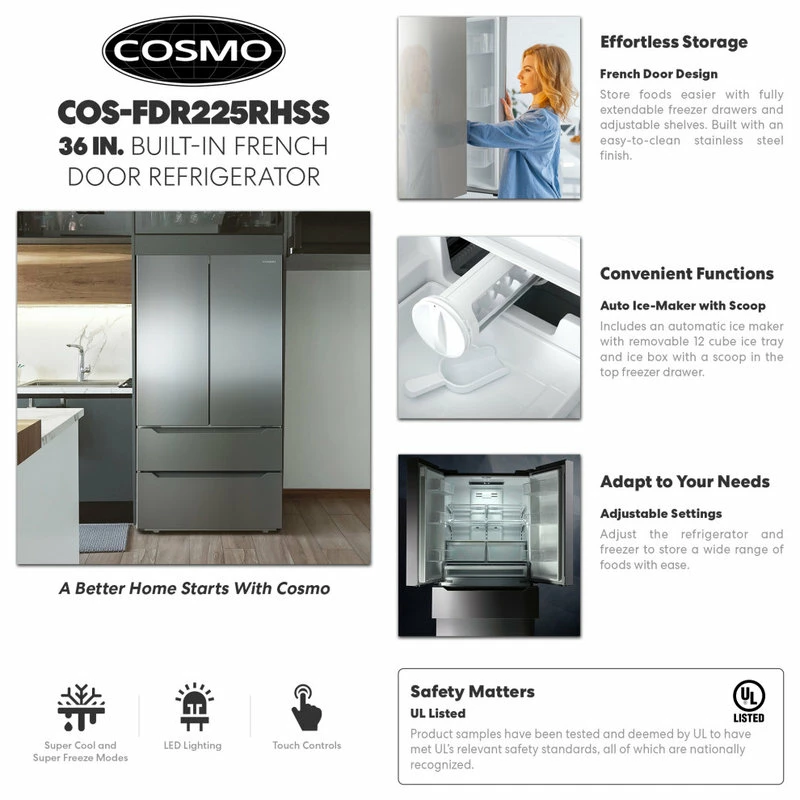 Cosmos Built-In French Door Refrigerator with 22.5 cu. ft. capacity has a sleek minimalist aesthetic and impressive innovative features. This spacious bottom-freezer refrigerator offers organizational versatility for effortless storage and access to a wide range of foods from meats to fresh produce. Fully extendable freezer drawers, adjustable shelves, and energy-efficient LED lights provide a clear view of all your fresh food. Our advanced preservation technology ensures you experience pleasure and convenience on a whole new level with perfect storage temperatures for maintaining fresher fruit, vegetables, fish, meat, and dairy products.