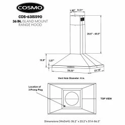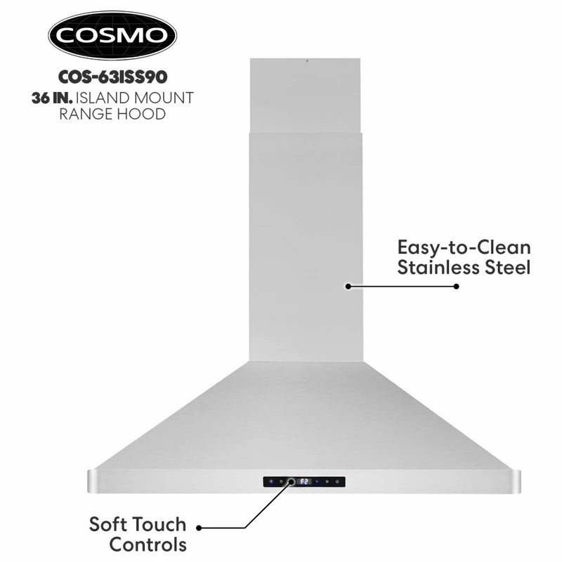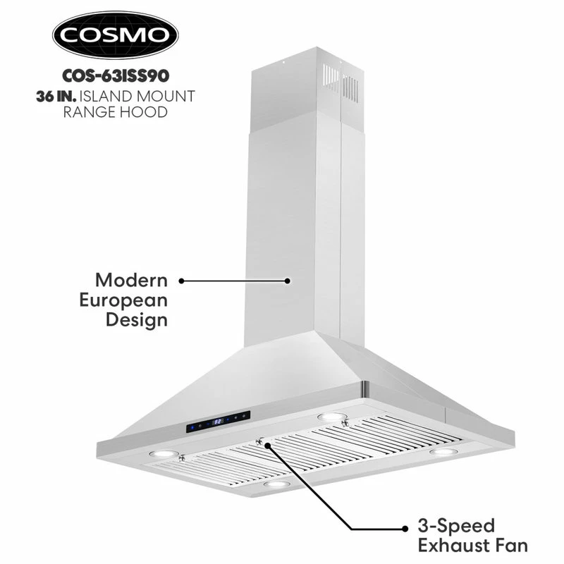 Cosmo’s 36 in. ductless Island Range Hood is in a class of its own. Coveted by kitchen design experts for its sophistication and ultra-modern aesthetic that seamlessly complements a variety of kitchen designs. The 63ISS90-DL Island Kitchen Hood includes modern features like an efficient 380 CFM centrifugal motor, soft-touch digital controls to operate the 3-speed fan, and Cosmo ARC-FLOW permanent filters that are dishwasher-safe and trap grease and oil better than any other filter. 4 x 2W LED lighting will illuminate your cooktop. Includes a 3-prong power plug for easy use.