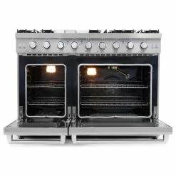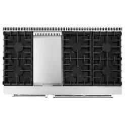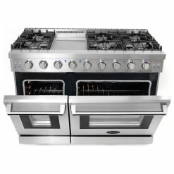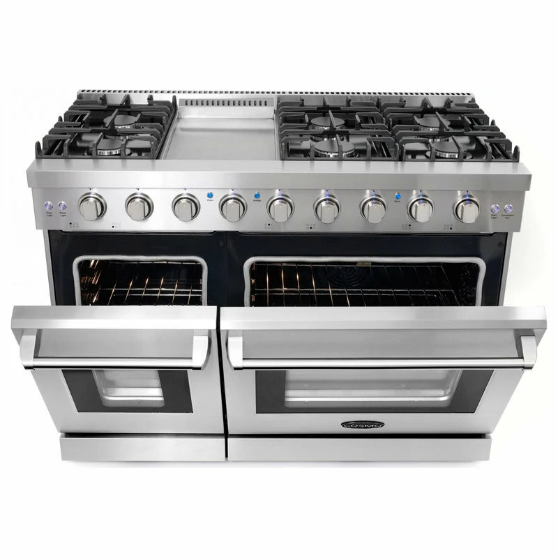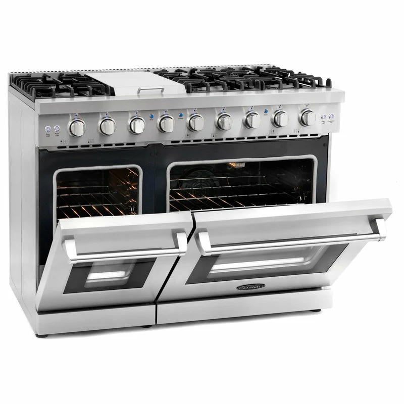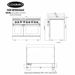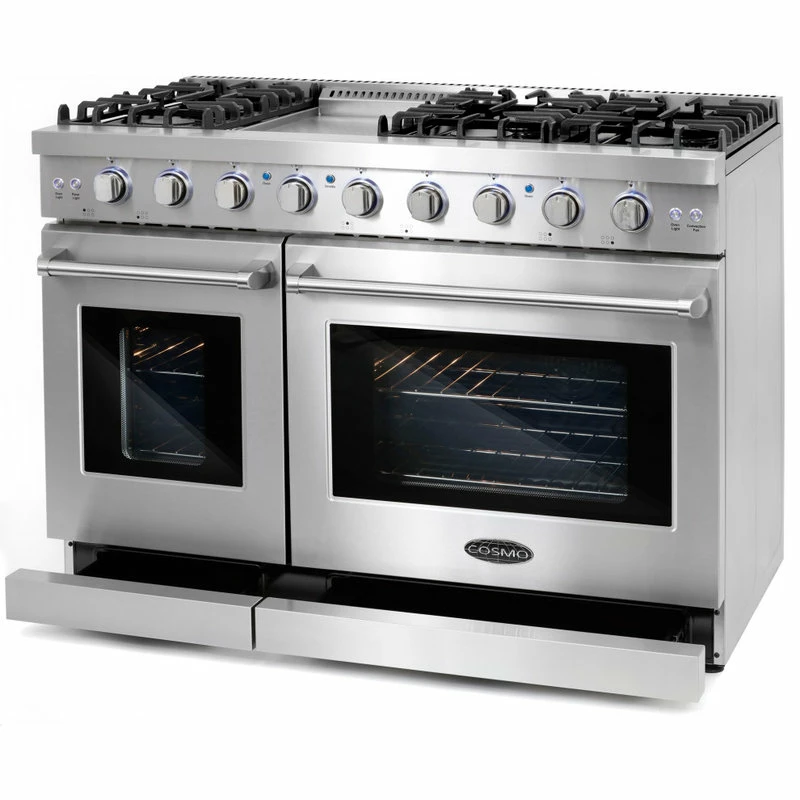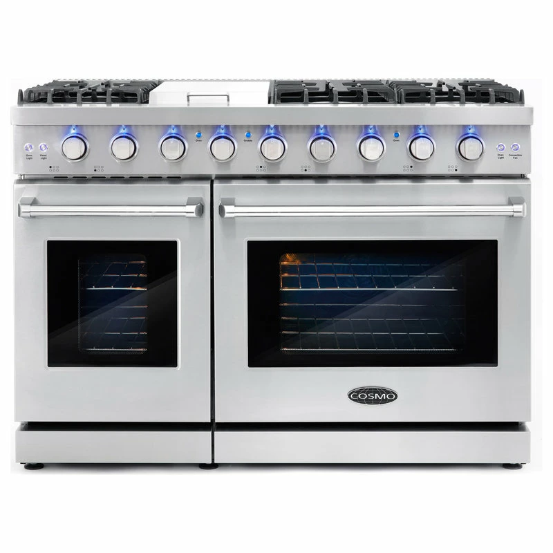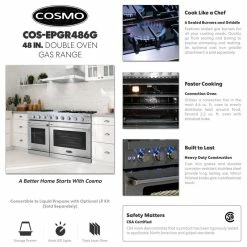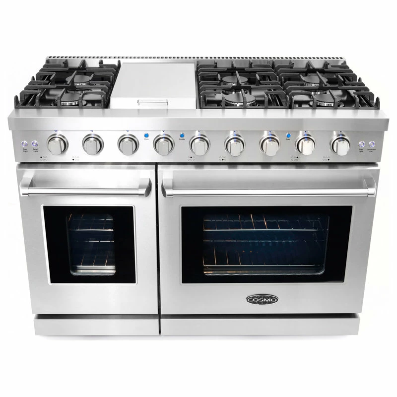 Discover a new world of cooking with Cosmo’s luxurious and powerful EPGR486G. This 48 in. gas range with double ovens was designed with performance in mind. The cooktop boasts 6 sealed stainless steel gas burners, giving you incredible versatility when cooking: one 18,000 BTU burner, 5x 12,000 BTU burners, as well as an additional 15,000 BTU griddle. The large, 4.6 cu. ft. convection oven features a fan designed to distribute heat and airflow for perfectly cooked meals, and the second, 2.2 cu. ft. oven is incredibly useful for cooking multiple courses at the same time. Four oven functions mean you’ll always have the right setting for any dish. Discover new heights to your culinary capability with Cosmo kitchen appliances.