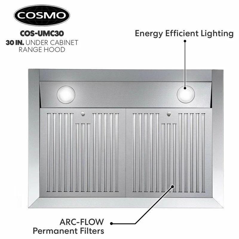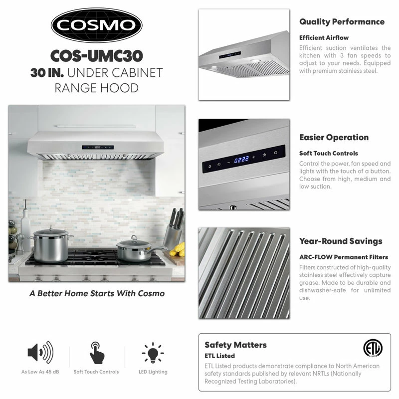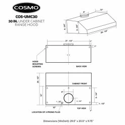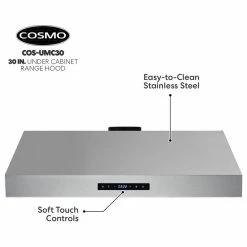 Give your kitchen a professional look with Cosmo’s COS-UMC30-DL ductless stainless steel kitchen hood. Featuring a sleek touchscreen and backlit display, you can control your fan speed, turn on the energy-efficient LED lights, or enable the timer with just a few taps. Our range hood is efficient and unobtrusive, moving 380 CFM of air at an ultra-quiet 65 dB, and dishwasher safe, permanent stainless steel filters make clean up a breeze. Our carbon filter kit is included for ductless and recirculating installation. Includes a 120V 3 prong power cord included for ease of installation. Cosmo Appliances are designed to give you professional luxury at factory-direct prices.