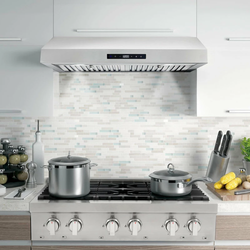 - Ultra-quiet ductless range hood mounts underneath your kitchen cabinets
