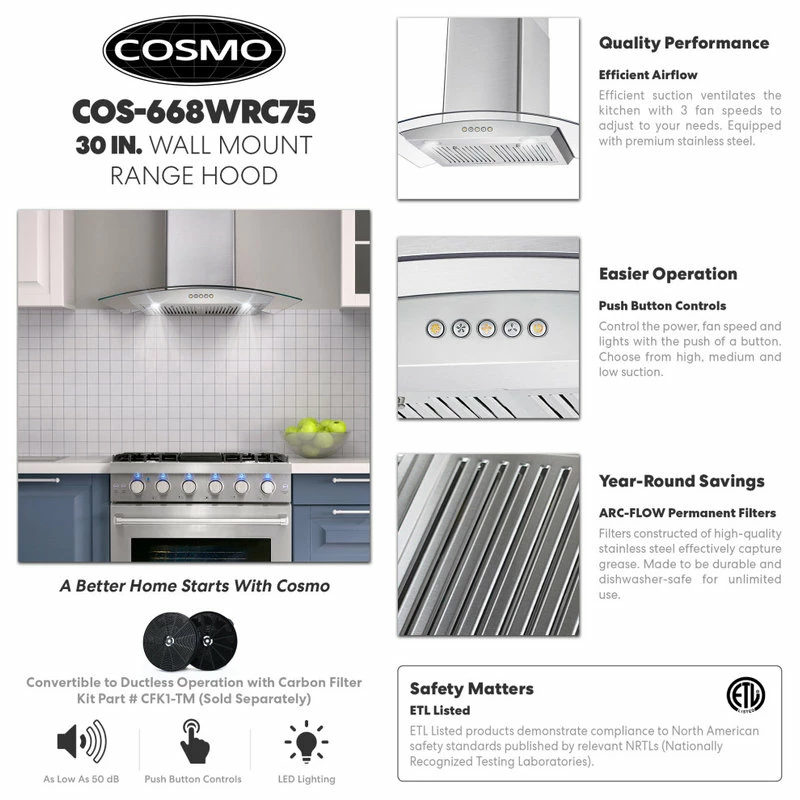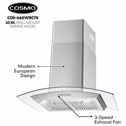 Cosmo’s COS-668WRC75-DL combines curved glass and stainless steel perfect for any modern kitchen. The flowing designs of our ductless 30″ wall mount kitchen hood come with a 380 CFM centrifugal motor that traps smoke and fumes from lingering in your home. Cosmo Range Hoods include ARC-FLOW Permanent Filters are the only filters that provide greater airflow and are dishwasher safe for easy clean-up. Push-button controls manage multiple functions, including 3 fan speeds and LED lighting for added visibility. This ductless range hood includes a 3-prong power plug for easy use.