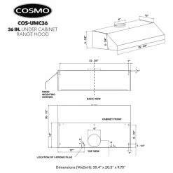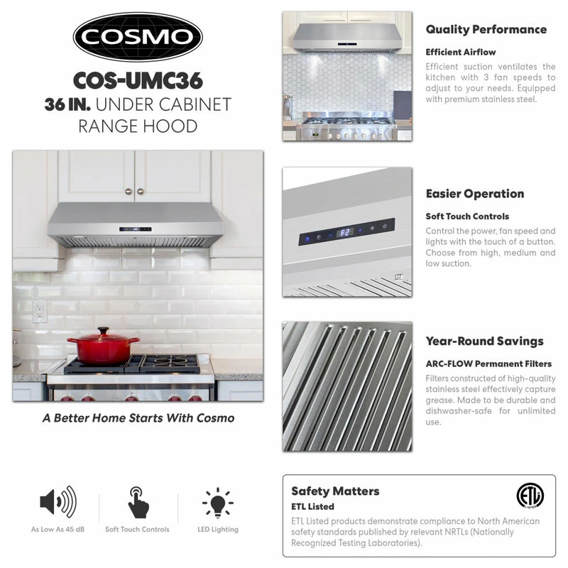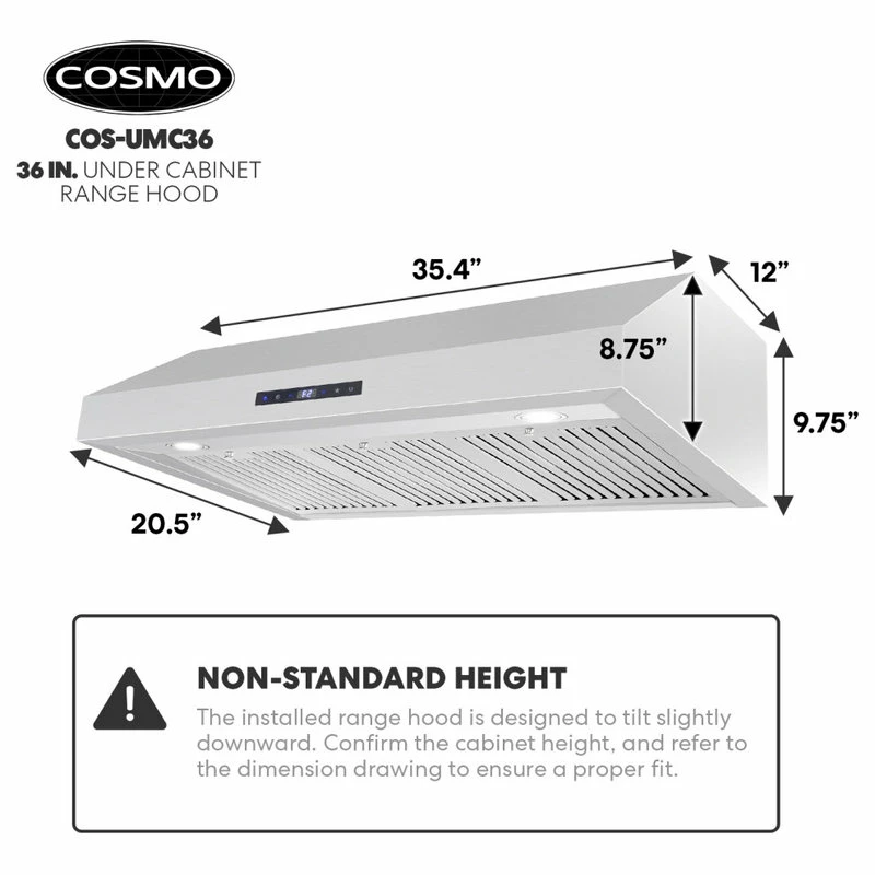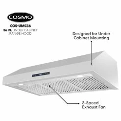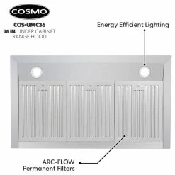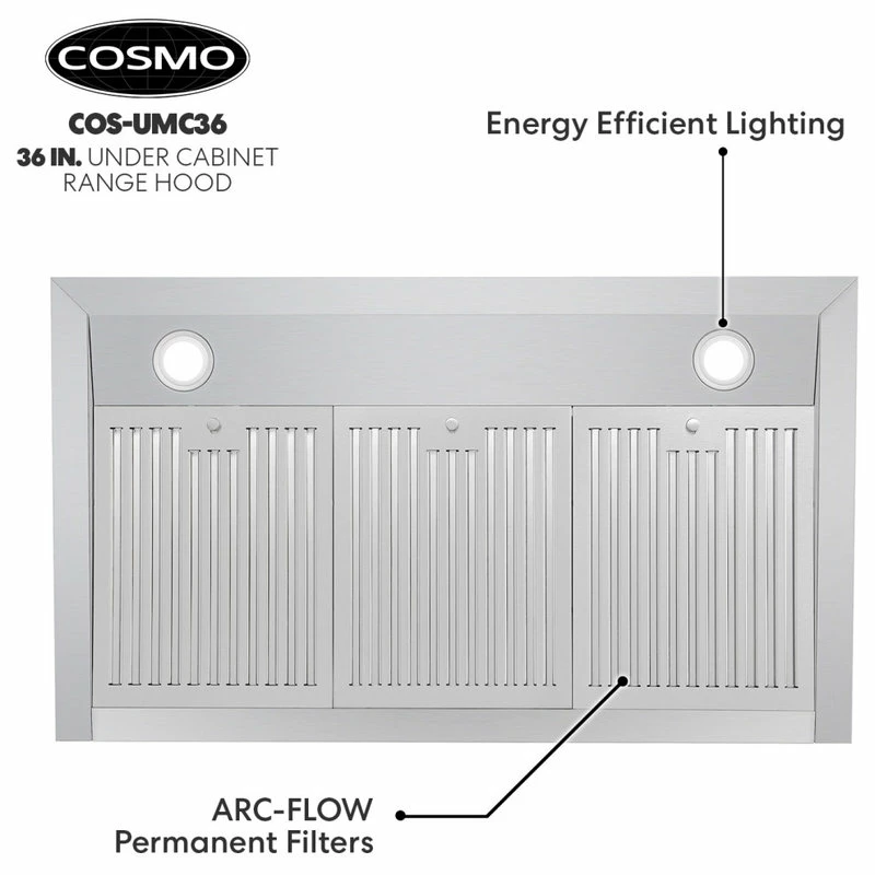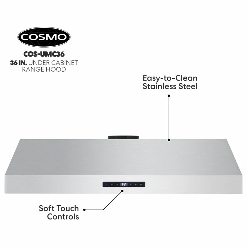 Go beyond basic air filtration with Cosmo’s COS-UMC36 under cabinet kitchen hood. This elegant unit has a sleek touchscreen with a backlit display. 380 CFM is available at your fingertips for efficient kitchen ventilation. Enable the convenient timer function and energy-efficient LEDs with just a few taps. The integrated display makes information available with just a quick glance. Dishwasher-safe stainless steel baffle filters are removable for easy no-mess clean-up.