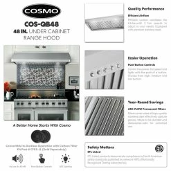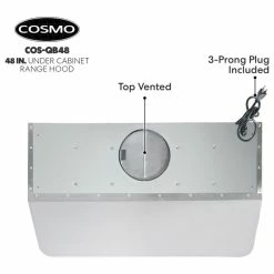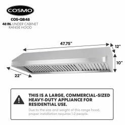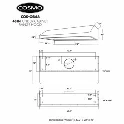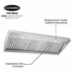 Cosmo’s COS-QB48 is the perfect choice for larger kitchens. At 48 inches, this under cabinet range hood is wide enough to handle large cooktops with several burners. Housed in a premium brushed stainless steel with seamless corners, this under cabinet range hood withstands high temperatures while maintaining a slim space-saving profile. Dual motors create 500 CFM of suction for efficient airflow and airborne grease removal. Easy-to-use push-button controls operate the 3-speed fan and bright white energy-efficient LEDs. Includes a 3-prong 120V power cord for easy installation.