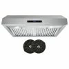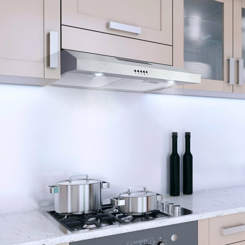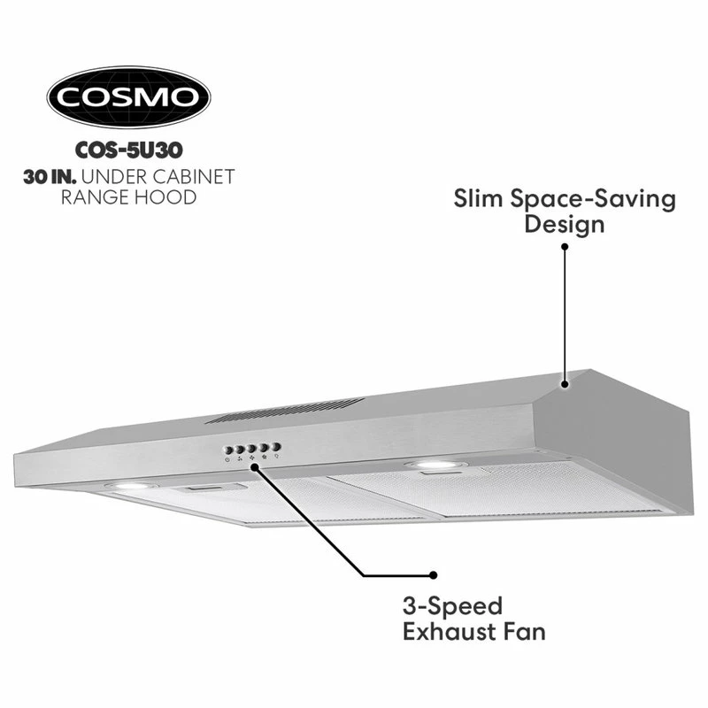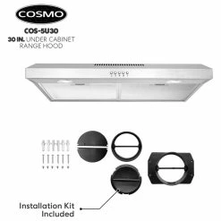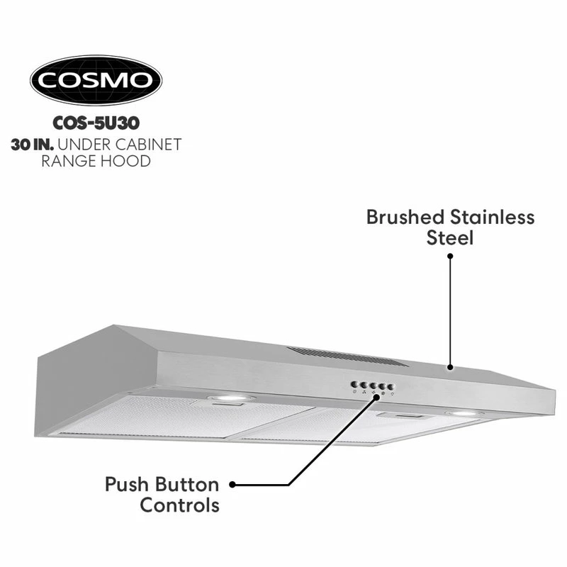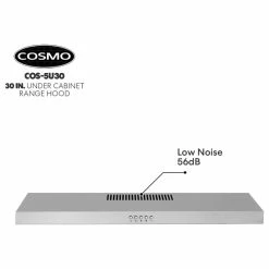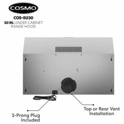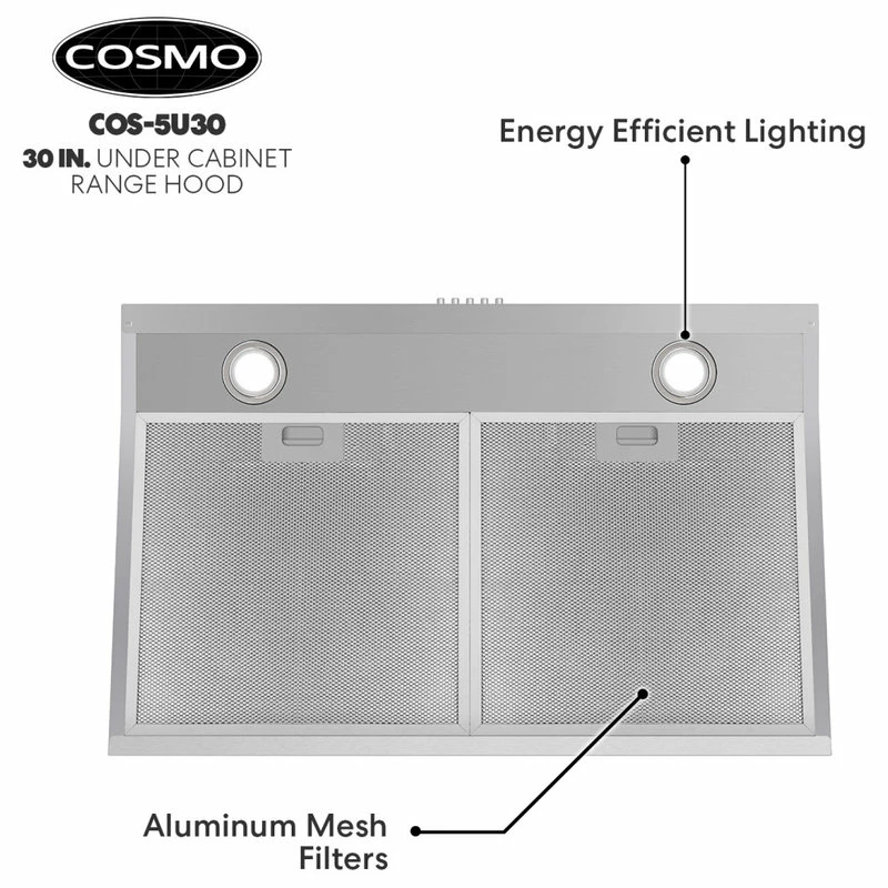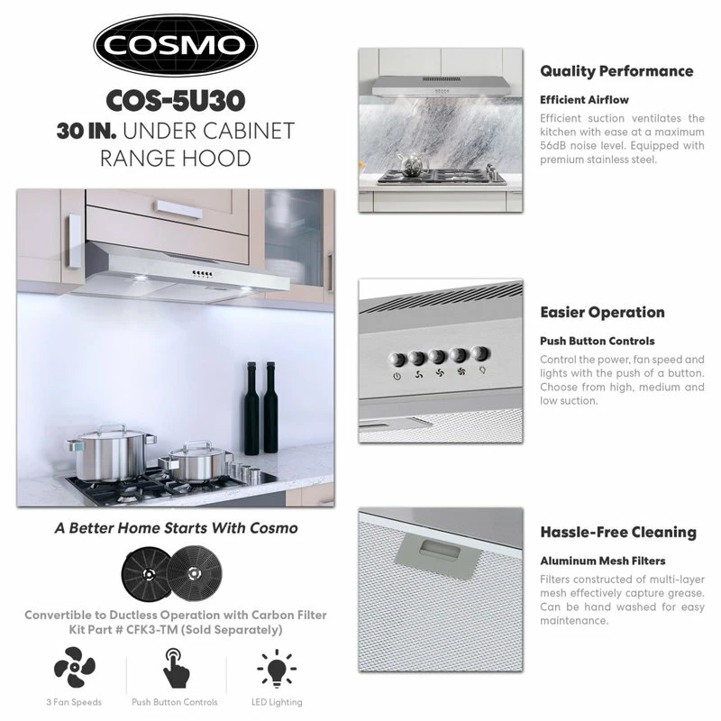 Cosmo’s new and improved COS-5U30 Under Cabinet Range Hood has modern sharp styling for any kitchen decor. Featured in brushed stainless steel, efficient airflow removes smells and odors with ease. Two dishwasher-safe aluminum mesh filters collect unwanted grease and oil from the air. Push button controls make using hood a breeze; choose from 3 fan speeds for the right amount of suction. Built-in energy-efficient LED lighting ensures visibility for cooking at all times of the day.