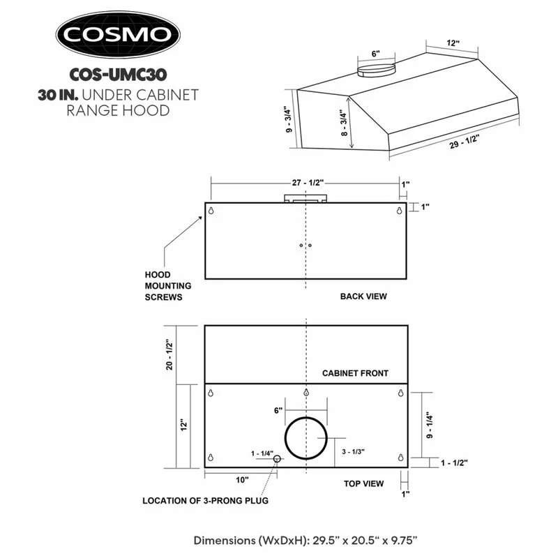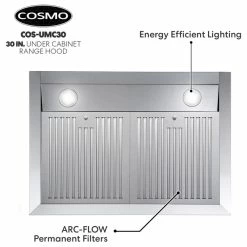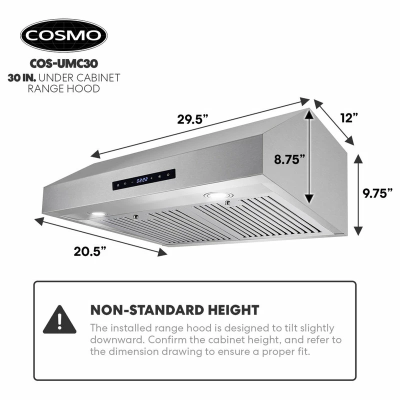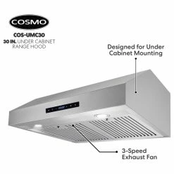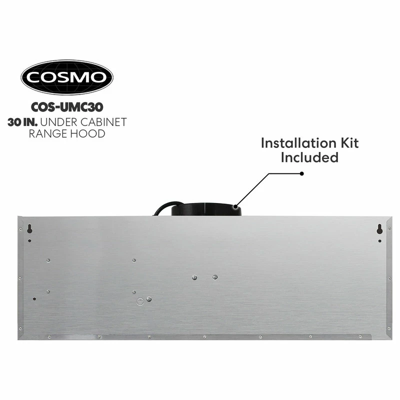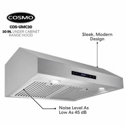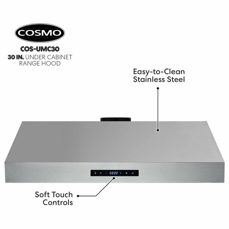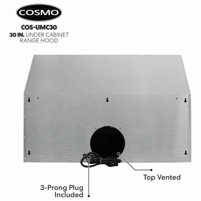 Give your kitchen a professional look with Cosmo’s COS-UMC30 brushed stainless steel range hood. Featuring a sleek touchscreen and backlit display, you can control your fan speed, turn on the energy-efficient LED lights, or enable the timer with just a few taps. Our range hood is efficient and unobtrusive, moving 380 CFM of air at an ultra-quiet 65 dB, and dishwasher safe, permanent stainless steel filters make clean up a breeze. The COS-UMC30 comes with a 120V 3 prong power cord included for ease of installation. Cosmo Appliances are designed to give you professional luxury at factory-direct prices.