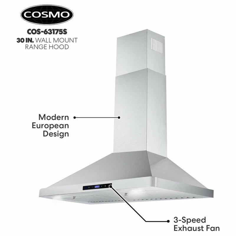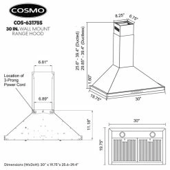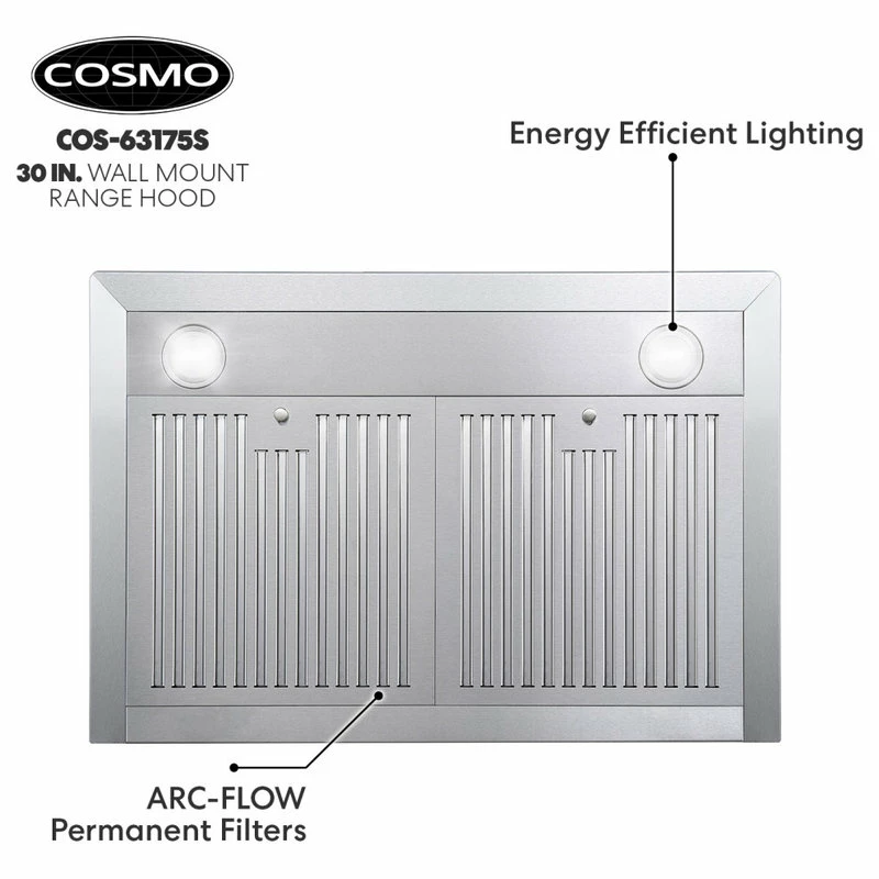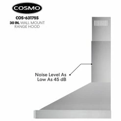 Upgrade your kitchen with Cosmo’s COS-63175S modern canopy wall-mount range hood. Our contemporary styling will feel right at home with modern kitchen decor. Experience the quality of our premium brushed stainless steel construction, built to withstand high heat, grease, oil, and steam. Our range hood includes a seamless three-sided chimney for clean, elegant lines. The motor provides 380 CFM of airflow, and our stainless steel Cosmo ARC-FLOW permanent filters are easy to clean and dishwasher safe to help save you time. This range hood is quiet, with a 65dB max, and energy-efficient, utilizing high lumen LED lighting for cost savings. The 3 prongs, 120V power cord is included for easy use. Trust Cosmo for your next appliance for premium quality at factory-direct prices.