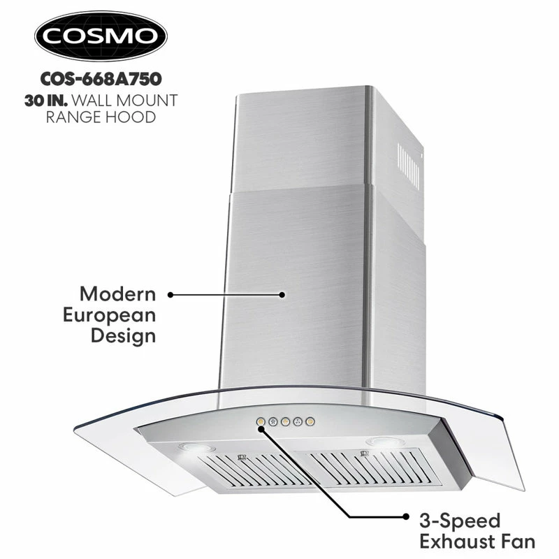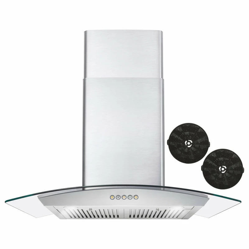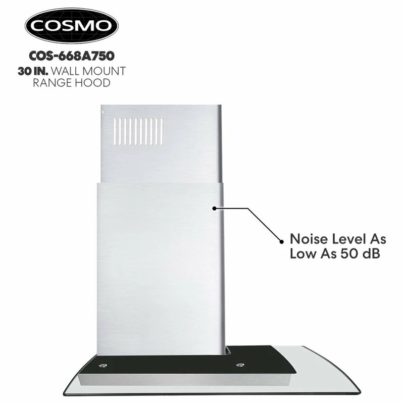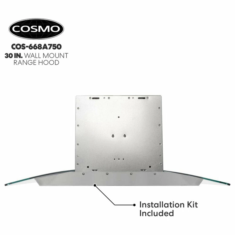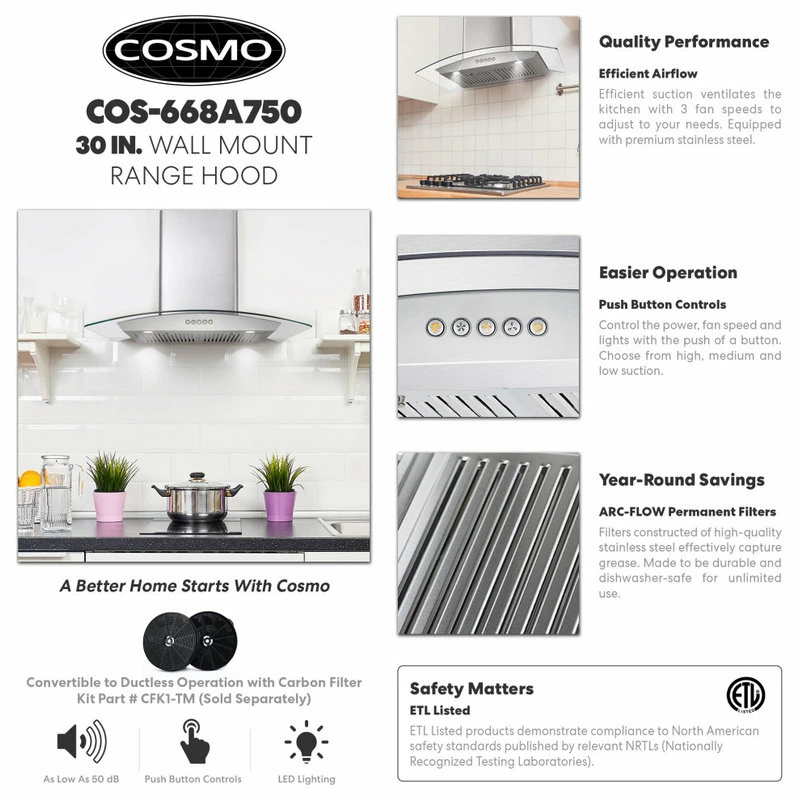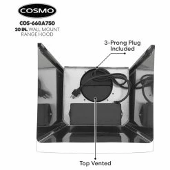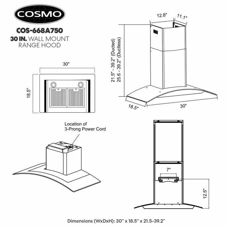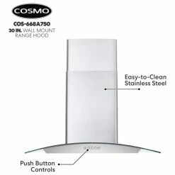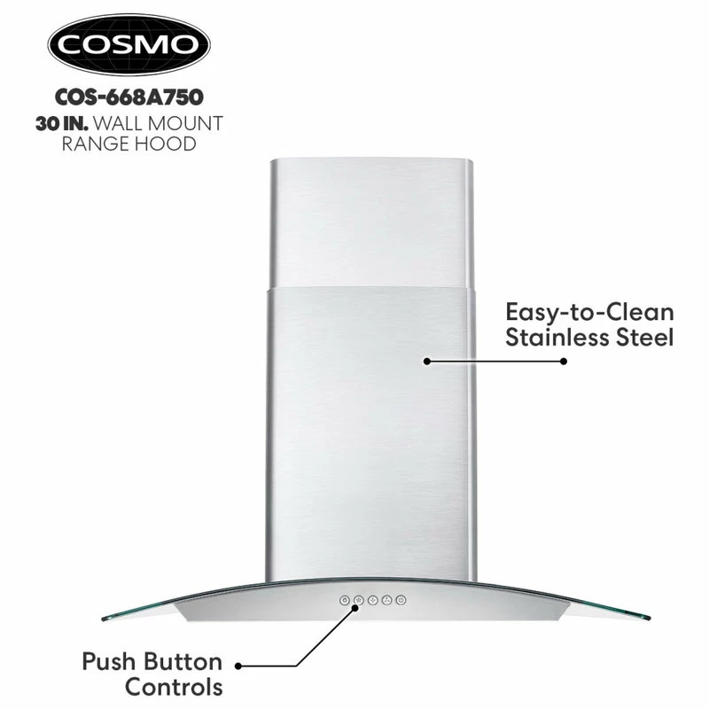 Take your kitchen decor to new heights. Cosmo’s 668A750-DL ductless wall mount range hood features a stainless steel body with a tempered glass visor. Our carbon filter kit is included for ductless and recirculating installation. Heavy-duty stainless steel permanent filters are dishwasher safe for easy clean-up. 380 cu. ft. per minute suction traps smoke and fumes from disturbing your home. The elegant glass visor captures smoke and steam, ensuring it doesn’t escape into your home. LED lighting is available for added visibility and controlled with easy push-button controls. Includes 3-prong power plug for easy use.