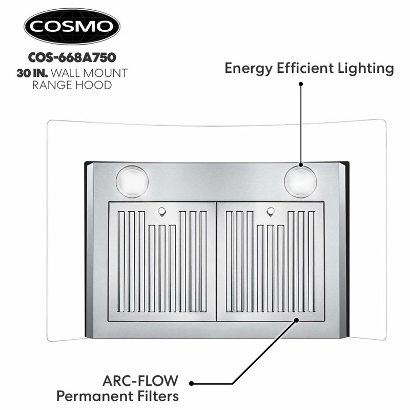 Cosmo ARC FLOW permanent filters are constructed of high-quality stainless steel to effectively capture grease and cooking odors and keep the air clean. No need to replace these filters, simply drop them in the dishwasher for easy maintenance.