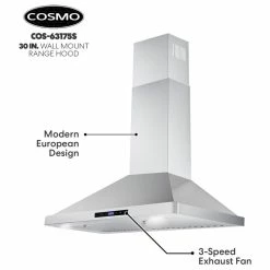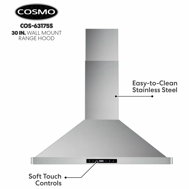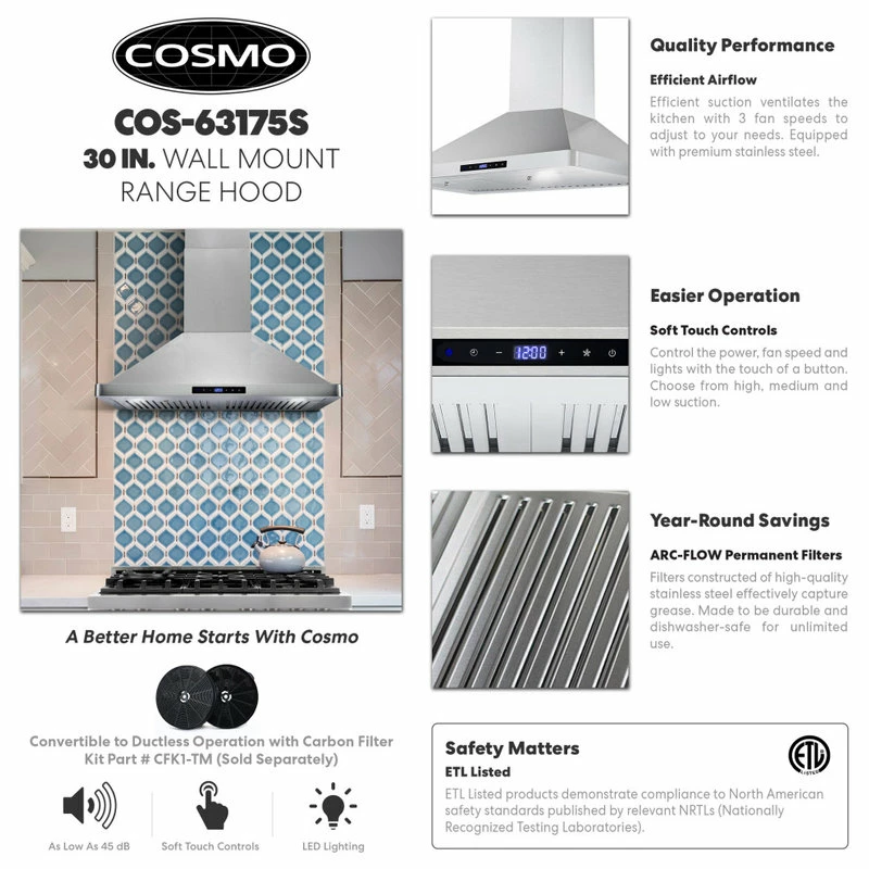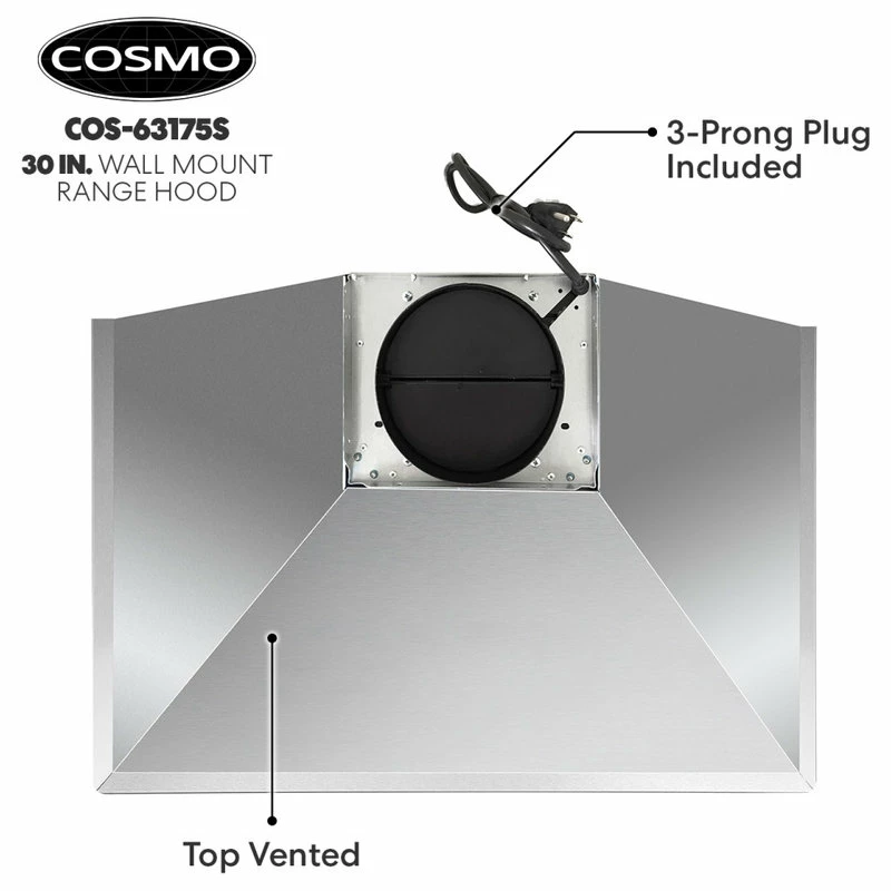 Refresh the design of your kitchen with Cosmo’s 63175S-DL modern canopy ductless wall mount range hood. Our premium brushed stainless steel is built to withstand high heat, grease, oil, and steam. Included carbon filters remove strong cooking smells and odors as this ductless range hood recirculates the air. Our wall mount range hood has a seamless chimney set on three sides for clean lines. A 3 prong 120V power cord is included for easy installation of this ductless range hood. Cosmo’s contemporary styling feels at home in modern decor and will give your kitchen an upscale, luxury feel.