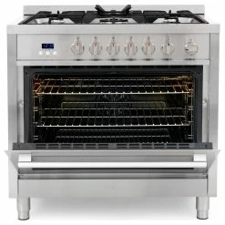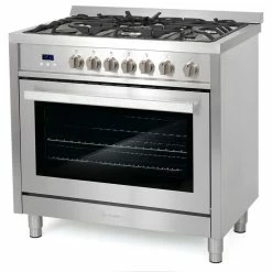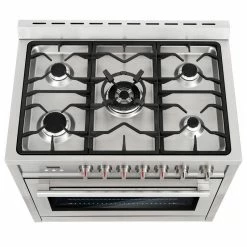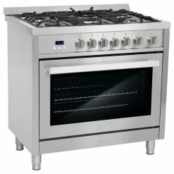 Bring professional quality home with Cosmo’s COS-965AGFC 36 inch single oven gas range in stainless steel. Featuring 5 high-performance burners, you can create culinary masterpieces from start to finish. The cooktop is equipped with one 17,400 BTU triple ring burner, one 8,200 BTU rapid burner, two 6,900 BTU semi-rapid burners, and one 5,000 BTU auxiliary burner, giving you both precision and power for a wide variety of needs. A large 3.8 cu. ft. oven provides ample space to cook for your whole family. Rapid convection technology delivers superior results by circulating air in the oven cavity to maintain even temperatures throughout- no more cold spots. A built-in display and electronic controls allow you to set the clock and timer for precision cooking.