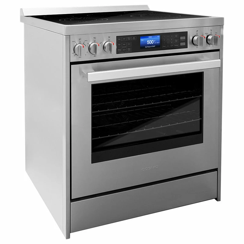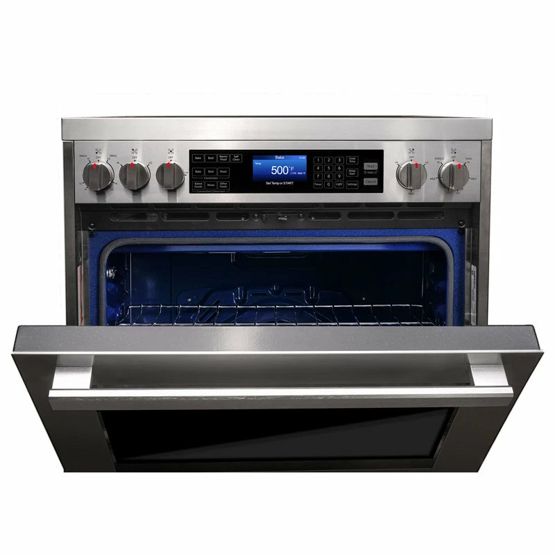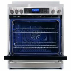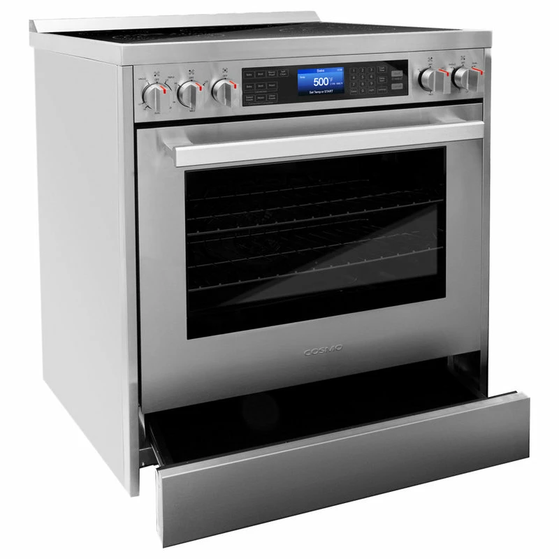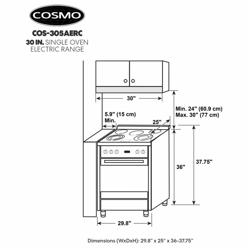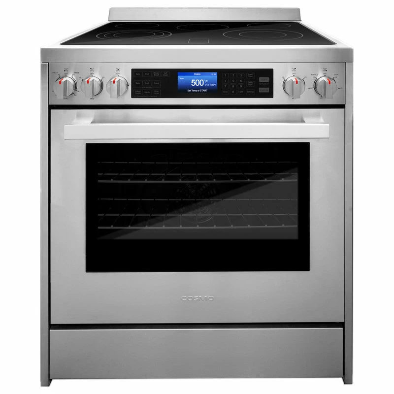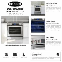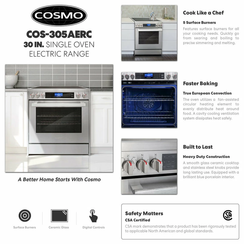 Refine your culinary skills when you cook with the Cosmo COS-305AERC 30 inch free standing electric range kitchen stove. This range features a 5-burner smooth glass ceramic cooktop with a blue oven interior, including one triple ring and one dual ring burner, each allowing you to customize your cooking surface, and a warming zone. The oven is equipped with Turbo True European Convection and seven different oven functions, so you can cook your way to unforgettable dishes, and achieve delicious results every time. The oven is also equipped with a precision temperature probe to ensure perfectly cooked meats- simply insert it and program the control to the desired temperature- no more guesswork. The oven also has a self-cleaning function to save you time and energy.