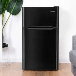 Our refrigerator will keep your food, drinks fresh and chilled. Equipped with a thermostat and cooling compressor, our mini refrigerator has a total capacity of 3.2 cubic feet. A roomy inside features a freezer compartment and two slide-out glass shelves, along with a bottle storage and a can dispenser built into the interior of the door. It offers ample storage space. An adjustable thermostat allows you to keep your foods at the ideal temperature. Its compact design is ideal for smaller areas such as student dormitories, wet bars, apartments and condos