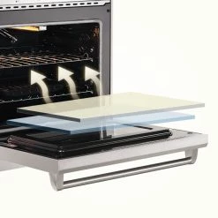 The commercial convection fan (push-button control) circulates heated air over, under and around, delivers the ideal temperature and airflow for fast preheating and uniform cooking helps remove cold spots to ensure even baking.
