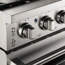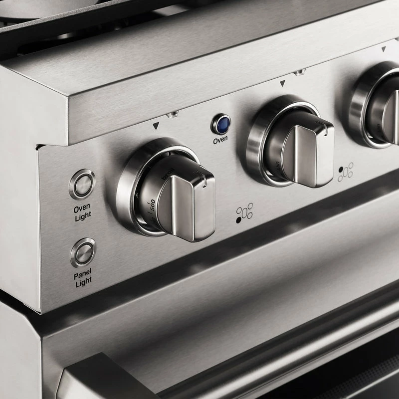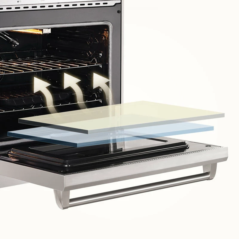The gas range come with large oven window and the G9 40W oven light (push-button control) allows you to see your food while cooking without opening the door. The triple layer tempered glass that adds to the eye-catching aesthetic of the complete exterior design.
