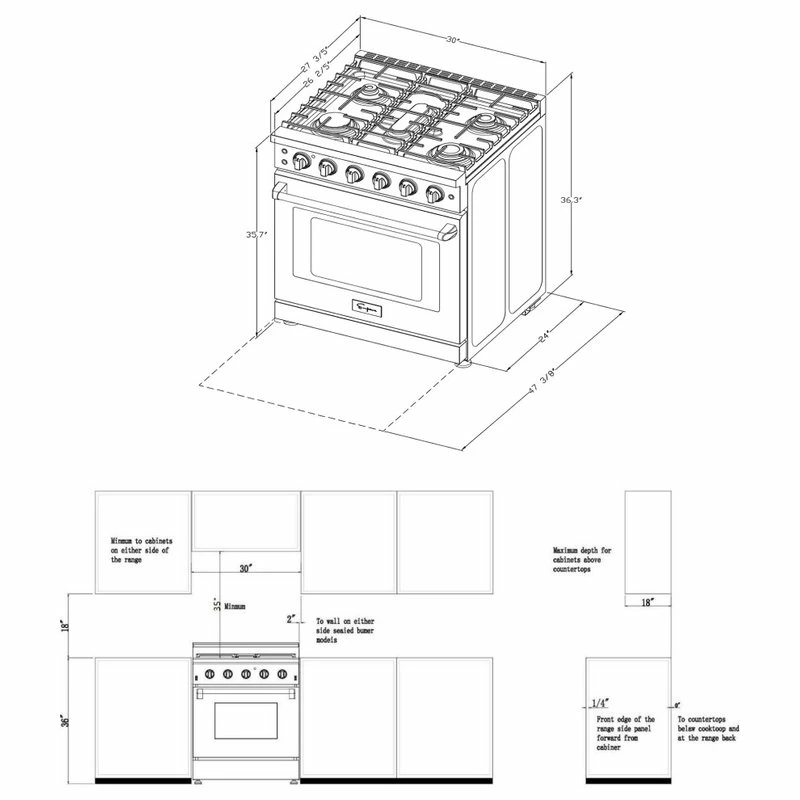 Product Dimensions: 30-inch W x 27.6-inch D x 36.3-inch H, Cutout Dimensions: 30.4-inch W x 24.4-inch D. With 2 Years US Based Manufacture Warranty. Pre-installed for natural gas (gas regulator included). Pre-installed US standard 120v power cord (electric ignitor), 30 amps breaker required.