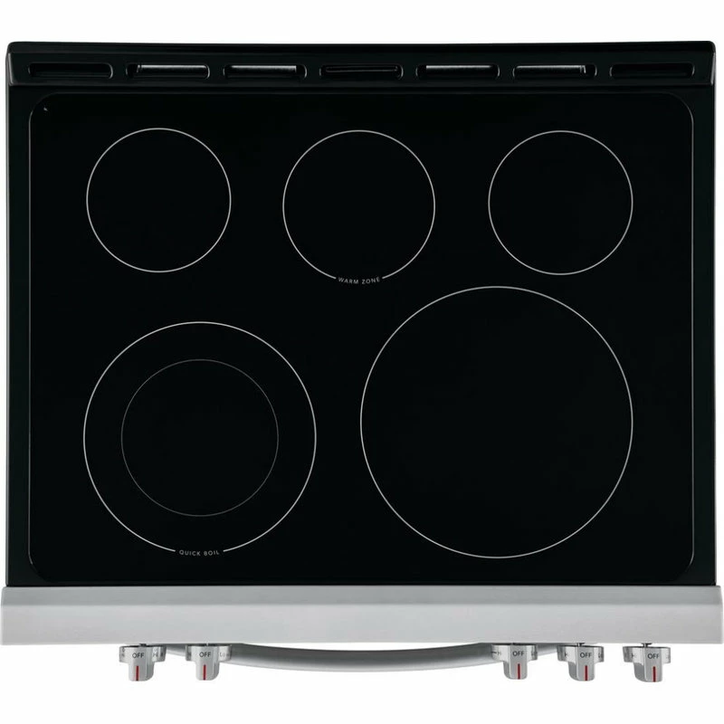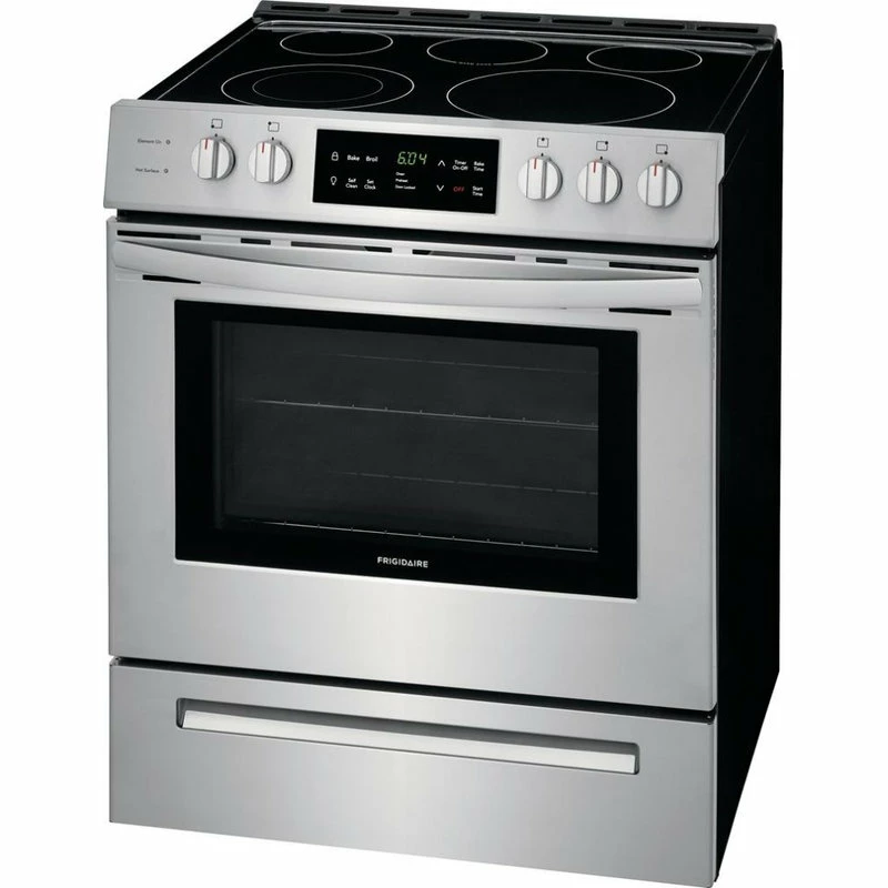 Frigidaire FFEH3054US 30 slide-in electric range by Frigidaire comes with 5 elements and a 5 cu. ft. oven capacity. It also features a keep warm zone. One-Touch self clean. hidden bake element. Store-More storage drawer and is ADA compliant.