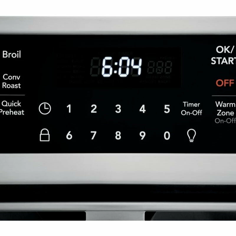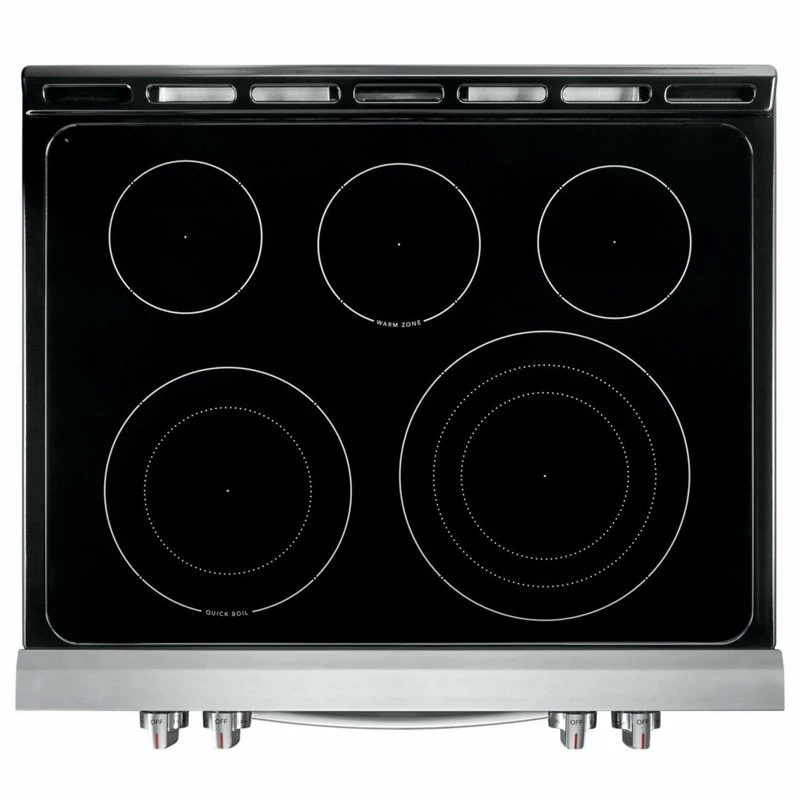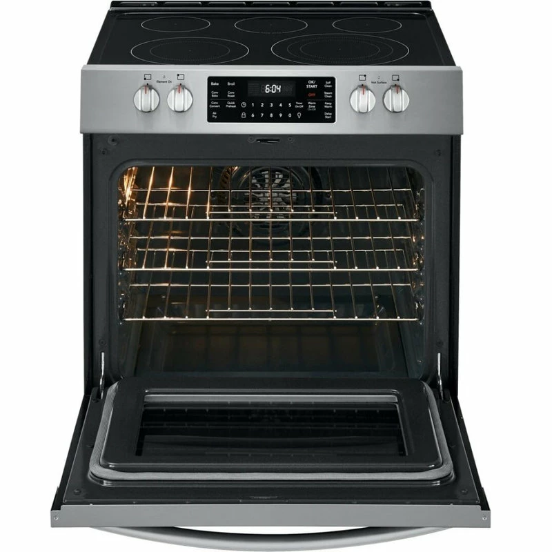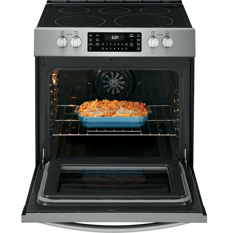 Frigidaire FGEH3047VF Gallery Series 30 Inch Slide-in Electric Range with 5 Elements, Smoothtop, 5.2 cu. ft. Total Oven Capacity, Convection, Delay Bake, Self-Cleaning Mode, Storage Drawer, ADA Compliant, Air Fry, SpaceWise Triple Expandable Element, Frigidaire Fit Promise, True Convection, Flexible Five Element Cooktop, Quick Preheat, Optional ReadyCook Air Fry Tray, UL Listed, Star-K Certified, CSA Listed, Keep Warm Function, Self-Cleaning, Convection Broil, Digital Temperature Display, Delay Clean Option, Timed Cook Option, Timer, Delay Start in Stainless Steel.