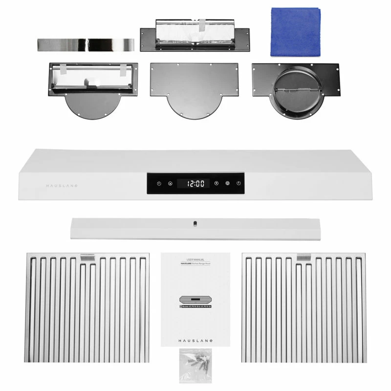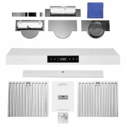 - Includes: oil tray (1), dishwasher-safe baffle filters (2), top 6” round exhaust adapter (1), aluminum foil tape (1), microfiber cloth (1), top 3-¼” by 10” rectangular exhaust adapter (1), and rear 3-¼” by 10” rectangular exhaust adapter (1)