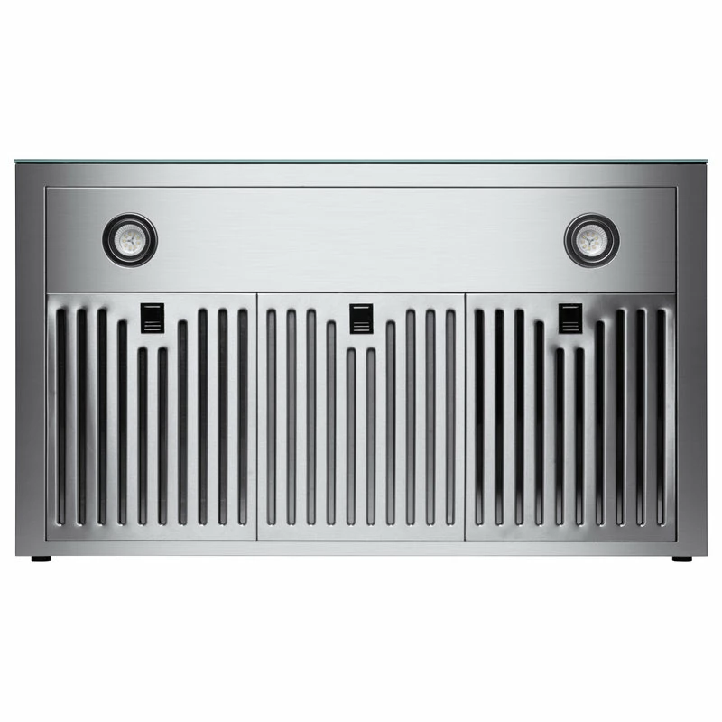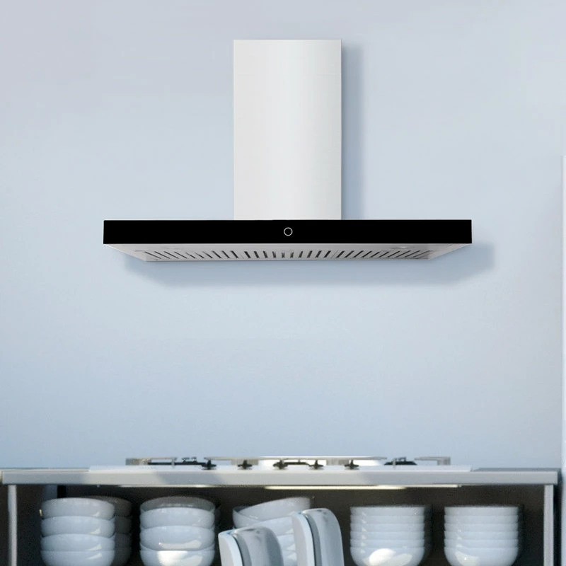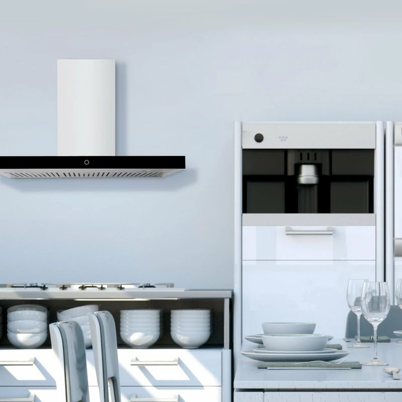 – CONTEMPORARY RANGE HOOD: This wall mount extractor’s contemporary design of tempered glass and stainless steel creates a bold, clean, and minimal statement suited to a modern or professional style kitchen.