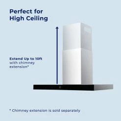 – IDEAL FOR HIGH CEILING & DUCTLESS KITCHEN: We have extended chimney cover to meet your 10-foot high ceiling kitchen. Measurements: 1′ x 11″ x 2’8″. Our charcoal filters are very effective to trap grease and remove odor. It’s the perfect solution for a ductless kitchen. Chimney extension and charcoal filters sold separately.