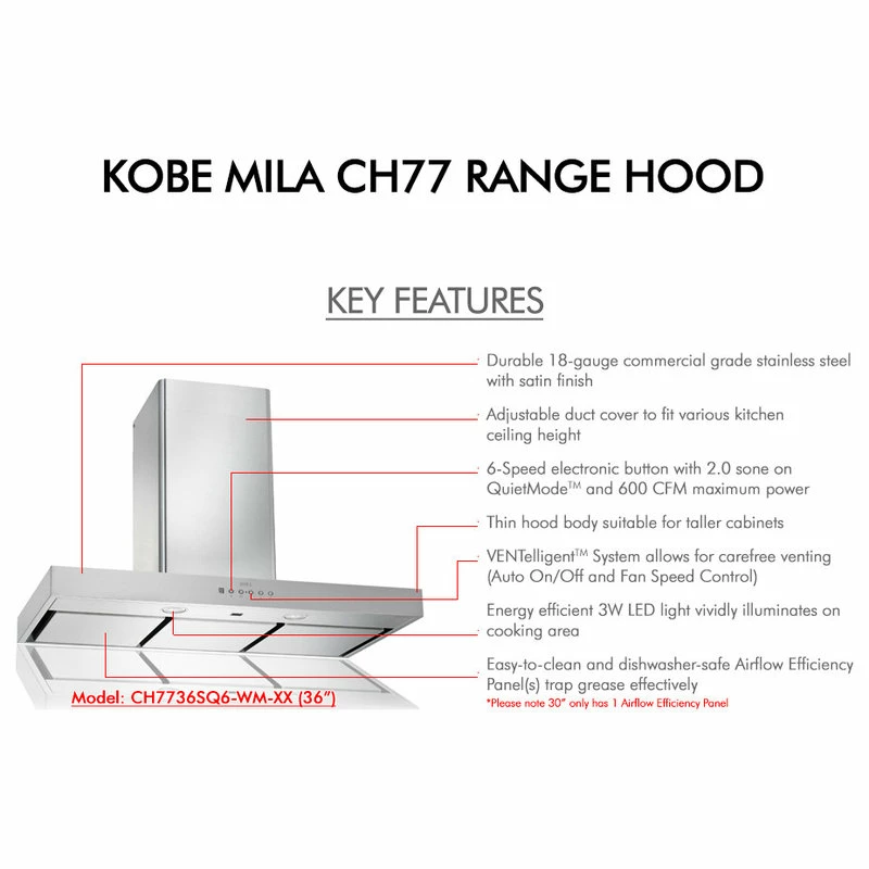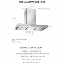 KOBE Range Hoods CH77 Series is our FIRST hands-free fully auto range hood! This range hood is compatible with all brands of gas ranges. The flame and temperature sensor automatically turns on and adjust the fan speed while cooking and turns it off after cooking. Available as under cabinet or wall mount with optional duct cover. This hood comes with Airflow Efficiency Panel(s) that will trap grease effectively and allow perimeter suction which can improve suction performance and sound reduction. Other features include ECO Mode technology, delay shutoff and 3-level lighting. Our exclusive ECO Mode uses very little power to turn the fan on at QuietMode for 10 minutes every hour to refresh the air. It fits ceiling height between 7 feet to 9 feet. This product is made in Taiwan.
