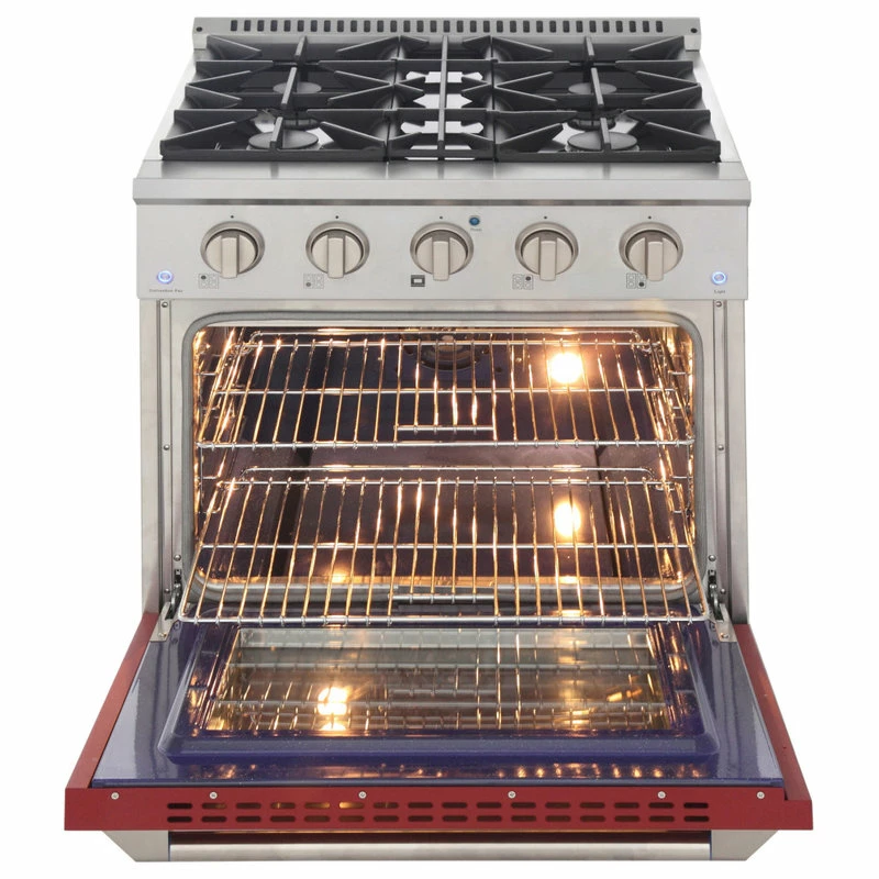 Fitting into most standard kitchens, this impressive 30 in. range boasts a 22,000 BTU convection oven, with a 10,000 BTU tube burner broiler. Enjoy cooking with your new Pro-Style range features two 15,000 BTU and two 9,000 BTU burners. The main feature of this series is the abilty to the change the look of your kitchen in less than 2 minutes by changing the color of the oven door and the kickplate. You can get a new color set (oven door and kickplate) for a really low price and change it whenever you like. The currently available colors are: Red, Blue, White, Green, Black and Silver. Add a set of colors knobs, and get the most of it by mixing and matching. 4th of July? Christmas? Your kitchen decor will be ready in 2 minutes!