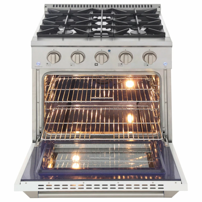 Fitting into most standard kitchens, this impressive 30 in. range boasts a 22,000 BTU convection oven, with a 10,000 BTU tube burner broiler. Enjoy cooking with your new Pro-Style range features two 15,000 BTU and two 9,000 BTU burners. The main feature of this series is the abilty to the change the look of your kitchen in less than 2 minutes by changing the color of the oven door and the kickplate. You can get a new color set (oven door and kickplate) for a really low price and change it whenever you like. The currently available colors are: Red, Blue, White, Green, Black and Silver. Add a set of colors knobs, and get the most of it by mixing and matching. 4th of July? Christmas? Your kitchen decor will be ready in 2 minutes!