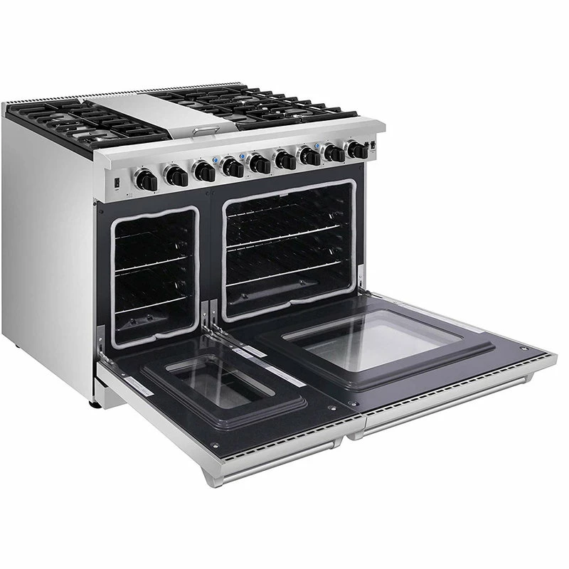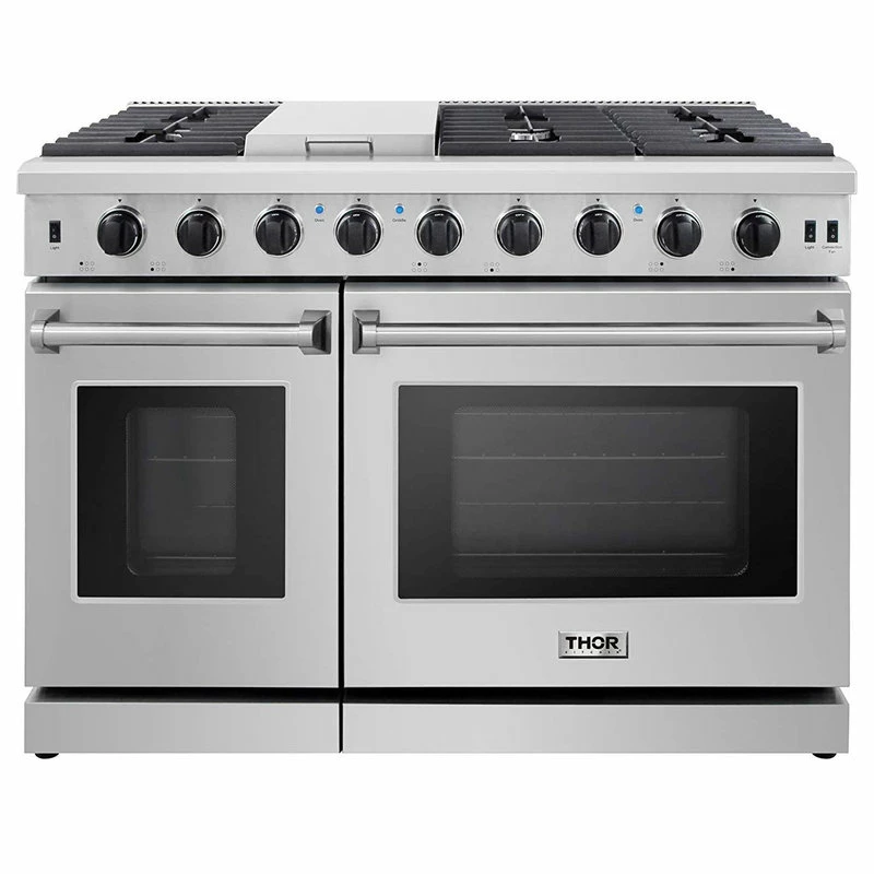 Thor Kitchen is dedicated to giving you professional style kitchen appliances. This professional freestanding gas range by Thor Kitchen comes with 6 sealed burners, griddle and dual oven with 6.8 cu. ft. total capacity. It also features black porcelain drip pan, heavy duty continuous cast iron grates and halogen oven lighting.