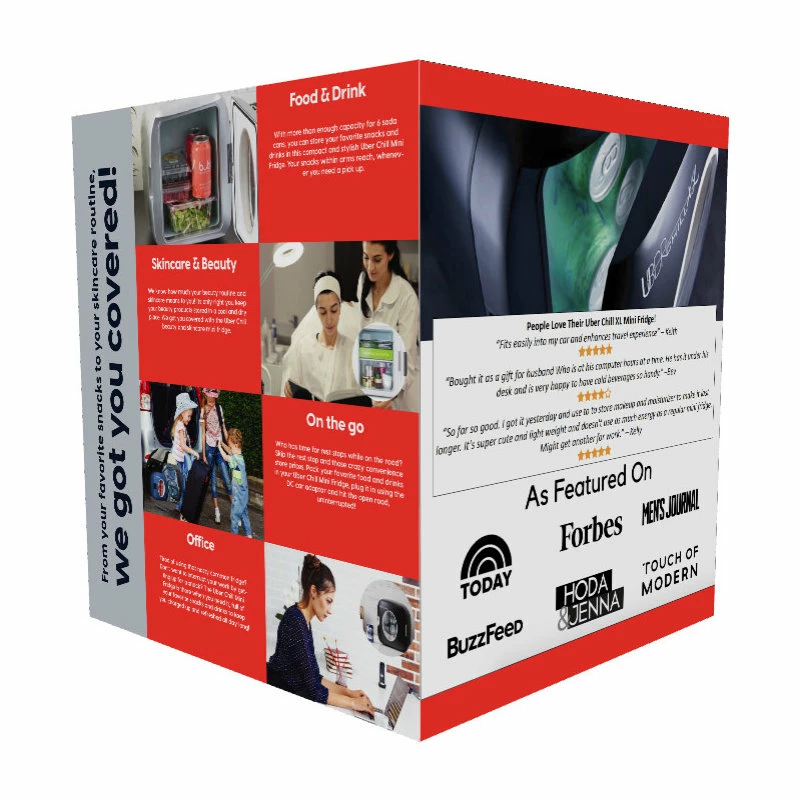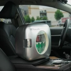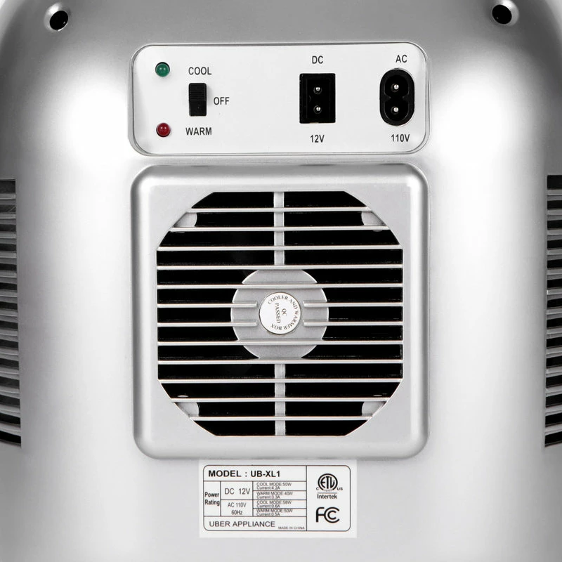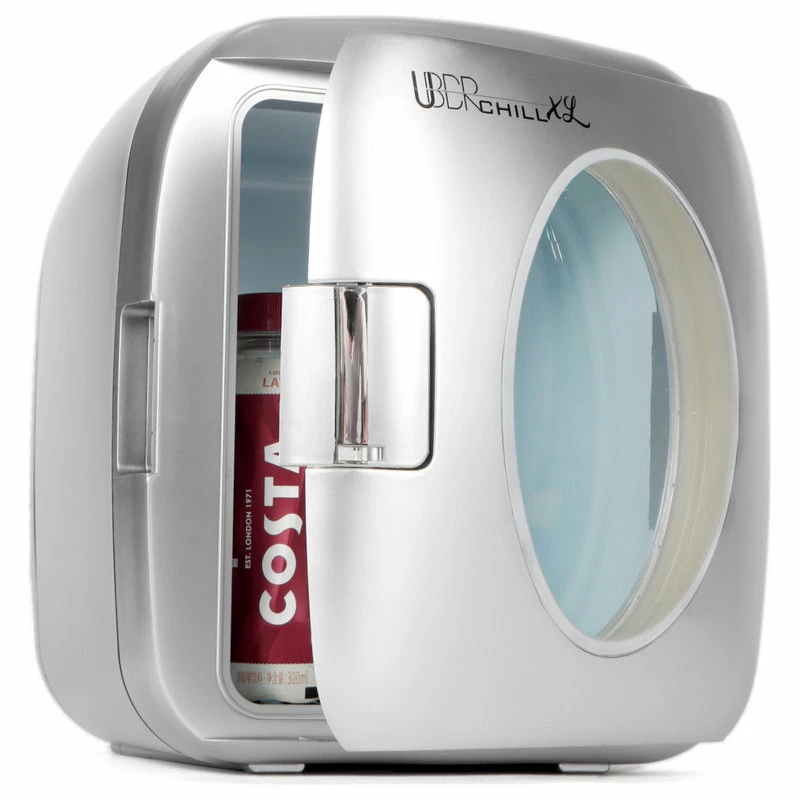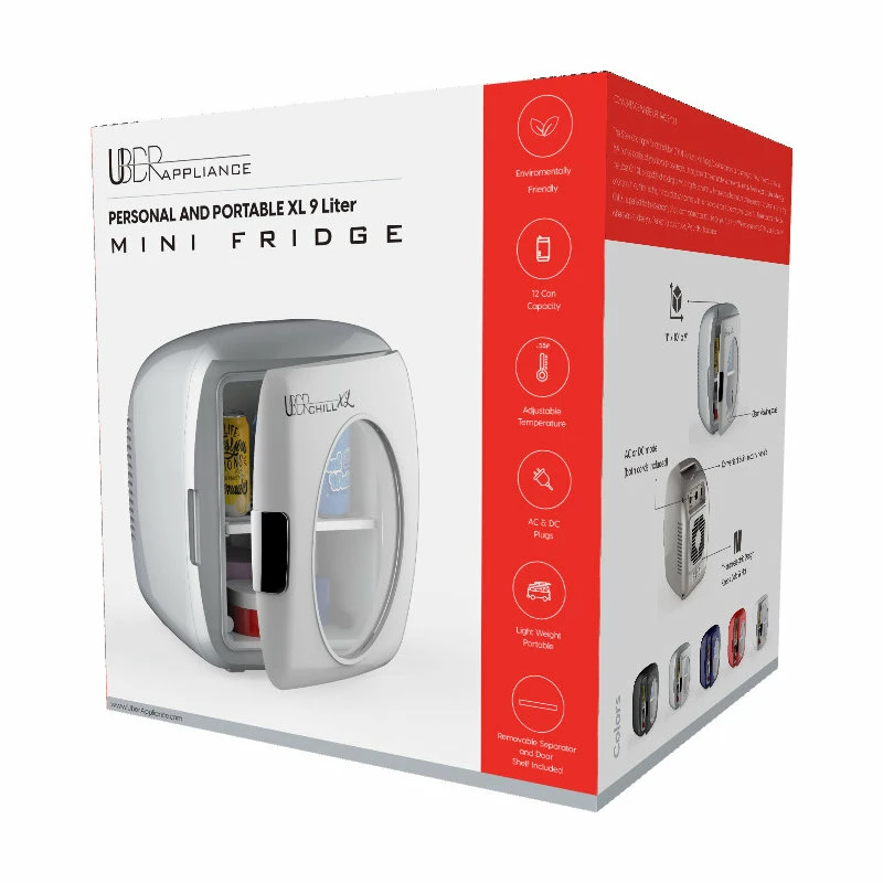The Sleek and highly functional Uber Chill XL Personal Mini Fridge/cooler is capable of housing up to twelve 12 ounce cans or six 16.9 ounce bottles of your favorite beverage. Utilizing state of the art and environmentally friendly thermo-electric peltier technology, this mini fridge is capable of cooling or warming the contents within a reasonable amount of time, making it convenient in almost any occasion. In addition to this, the portable unit comes with both standard home and car power cables for ultimate portability. This is a great mini fridge for the bedroom, this small refrigerator is great as a dorm fridge, or a cubicle mini fridge.