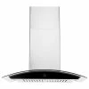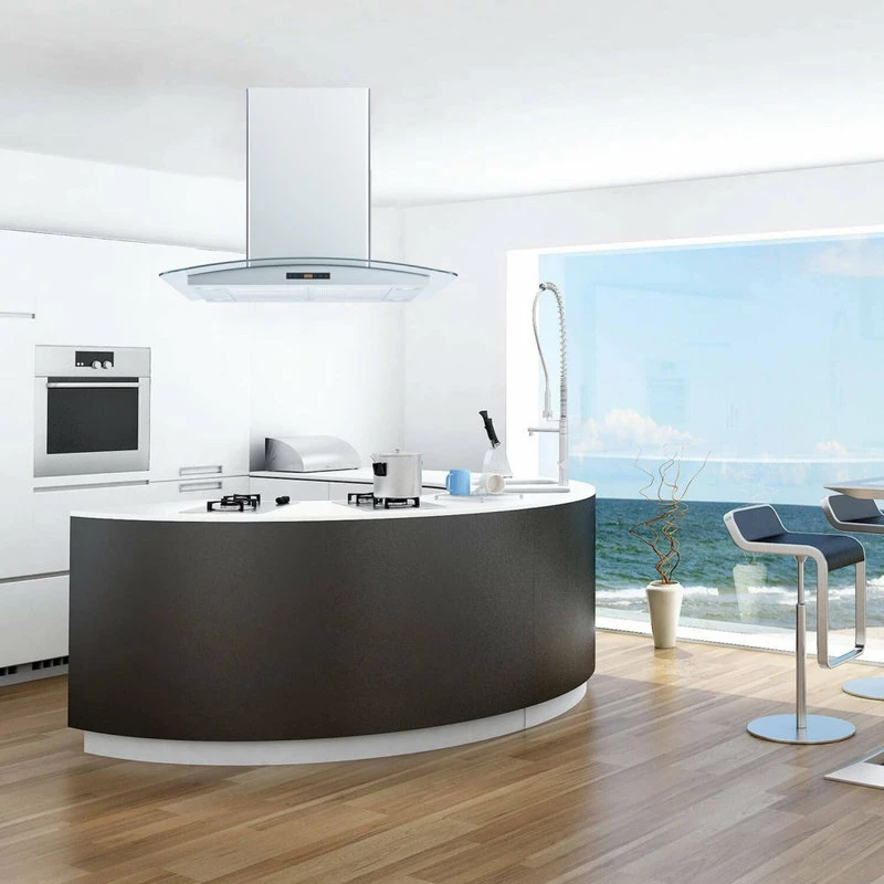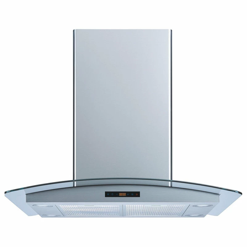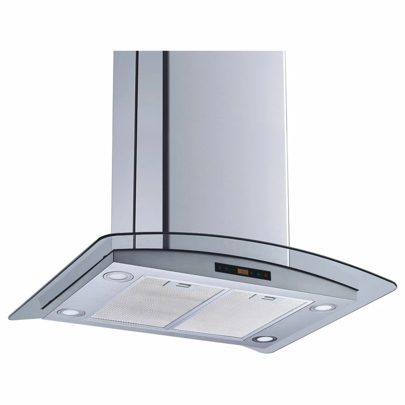 This beautiful island mounted range hood will create splendor and elegance in your kitchen. Constructed of high quality stainless steel and clear tempered glass. Complete with aluminum mesh filters that remove smoke and grease from your cooking area and are dishwasher safe. Powerful suction with 475 CFM air flow rate is perfect for household use and an ideal balance between power, energy efficiency and noise control. This model also comes with 4 bright energy saver LED lights, low noise level operation, touch sensor control panel for 3-level fan speed, time display and delay shut off. This range hood comes with all the parts you need for easy installation. Adjustable chimney can fit 8 to 9 ft. ceiling. This unit is convertible, can be vented out of your dwelling or recirculating (ductless) with 2-pieces Charcoal filters (part # WRHF004S2, sold separately) to help reduce odors.
