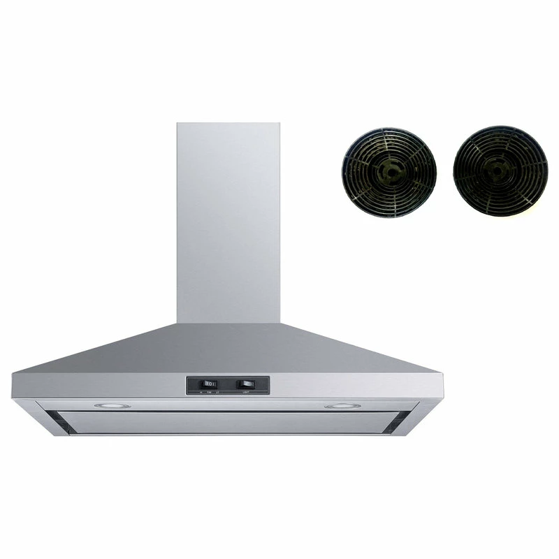 This 30 in. wall mounted range hood is constructed of premium 430 stainless steel. Aluminum mesh filter and flat stainless steel sound shield panel are dishwasher safe and easy to remove, clean and reduce noise.. unique 4-way sides suction design removes smoke and grease efficiently. This model also comes with 2 bright energy saver LED lights, low noise level operation, 180 CFM airflow, easy to operate rocker controls for high and low fan speed and on and off light switch. All the components such as damper, mounting hardware, flexible duct work and damper are included for easy installation. Adjustable and telescoping chimney can fit 7.5-8.5 ft. ceiling. This unit is convertible, can be vented out of your dwelling or recirculating (ductless) with 2 pieces. Charcoal filters (included, part # WRHF003S2) to help reduce odors,