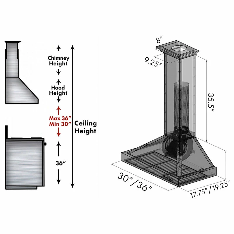 ZLINE 30 in. 400 CFM Designer Series Wall Mount Range Hood (KB2-BCXXX-30) has a modern design and built-to-last quality that would make it a great addition to any home or kitchen remodel. This hoods high-performance 4-speed motor will provide all the power you need to quietly and efficiently ventilate your kitchen while cooking. Modern features, including built-in lighting and dishwasher-safe stainless steel baffle filters for easy clean-up, will make using this hood a simple, enjoyable experience for years to come. ZLINE Hoods are ETL Listed and have one of the easiest installations in the industry. Includes a 36 in. chimney with elegant crown molding for ceilings up to 9.5 ft. (must be custom cut to appropriate height) and a 61 in. Chimney Extension (not included) is available for ceilings up to 12.5 ft. Charcoal Filters and Vented Crown Molding (not included) are available for Ductless Option. ZLINE stands by all products with its Manufacturer Parts Warranty.