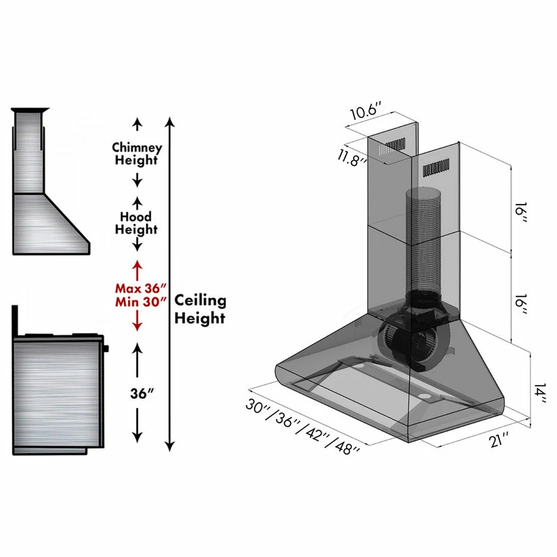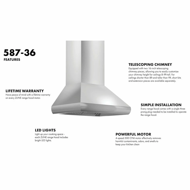 ZLINE 36 in. 900 CFM Professional Wall Mount Range Hood in Stainless Steel (587-36) has a modern design and built-to-last quality that would make it a great addition to any home or kitchen remodel. This hood’s high-performance 4-speed motor will provide all the power you need to quietly and efficiently ventilate your kitchen while cooking. Modern features, including built-in lighting and dishwasher-safe stainless steel baffle filters for easy clean-up, will make using this hood a simple, enjoyable experience for years to come. ZLINE Hoods are ETL Listed and have one of the easiest installations in the industry. Includes two(2)-16 in. telescoping chimney pieces for approximately 8-9 ft. ceilings. Chimney Short Kits and Extensions (not included) are available for shorter or taller ceilings. ZLINE stands by all products with its Manufacturer Parts Warranty.