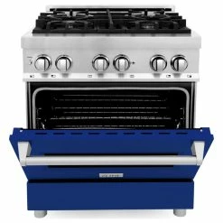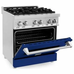 Luxury isn�t meant to be desired – it�s meant to be attainable. Designed in Lake Tahoe, USA, the ZLINE 30″ 4.0 cu. ft. Dual Fuel Range with Gas Stove and Electric Oven in Stainless Steel and Blue Gloss Door (RA-BG-30) provides a professional culinary experience by pairing unmatched performance with timeless style. Achieve ZLINE Attainable Luxury� excellence with innovative features designed to enhance your kitchen�s capability.
