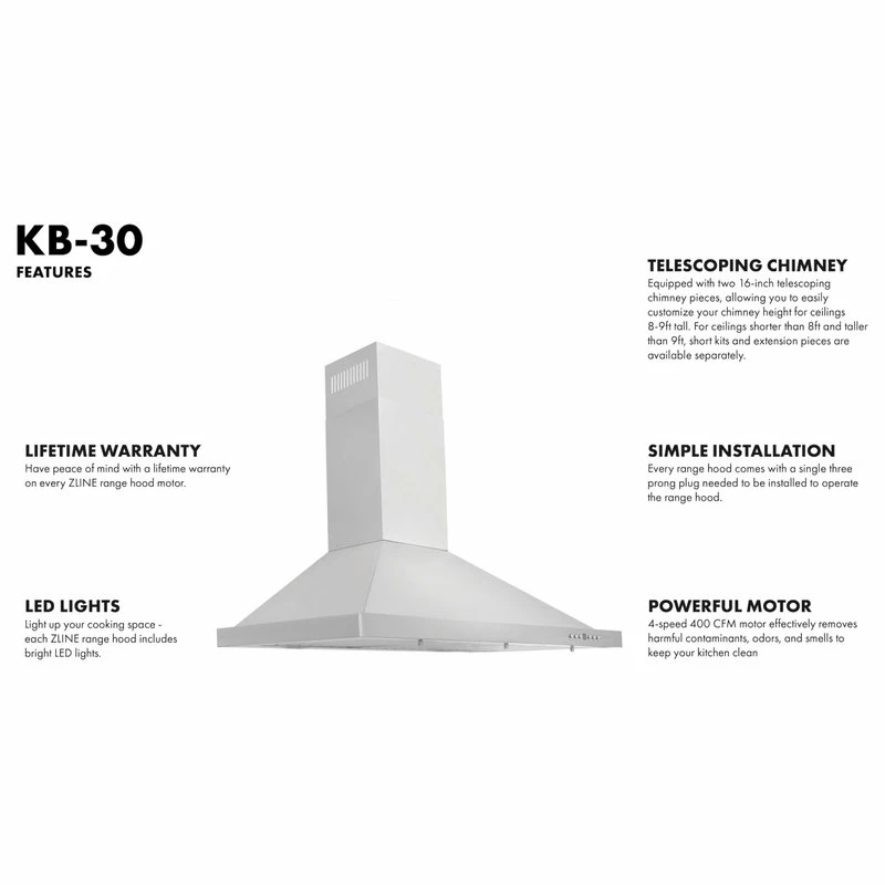 The ZLINE KB-30 is a 30 in. professional wall mount stainless steel range hood with a modern design and built-to-last quality, making it a great addition to any kitchen. This hood’s high-performance, 400 CFM 4-speed motor will provide all the power you need to quietly and efficiently ventilate your stove while cooking. With its classic 430 grade stainless steel, this range hood contains rust, temperature, and corrosion-resistant properties to ensure a durable vent hood that will last for years to come. Enjoy modern features, including built-in LED lighting for an illuminated culinary experience and dishwasher-safe stainless steel baffle filters for easy clean-up. This wall mount range hood has a convertible vent, so you can have a luxury range hood whether you need a ducted or ductless option. Enjoy easy installation and an easy recirculating conversion process. Experience Attainable Luxury in the heart of your home, with a ZLINE range hood. ZLINE Kitchen and Bath stands by all products with its manufacturer parts warranty. The KB-30 ships next business day when in stock.